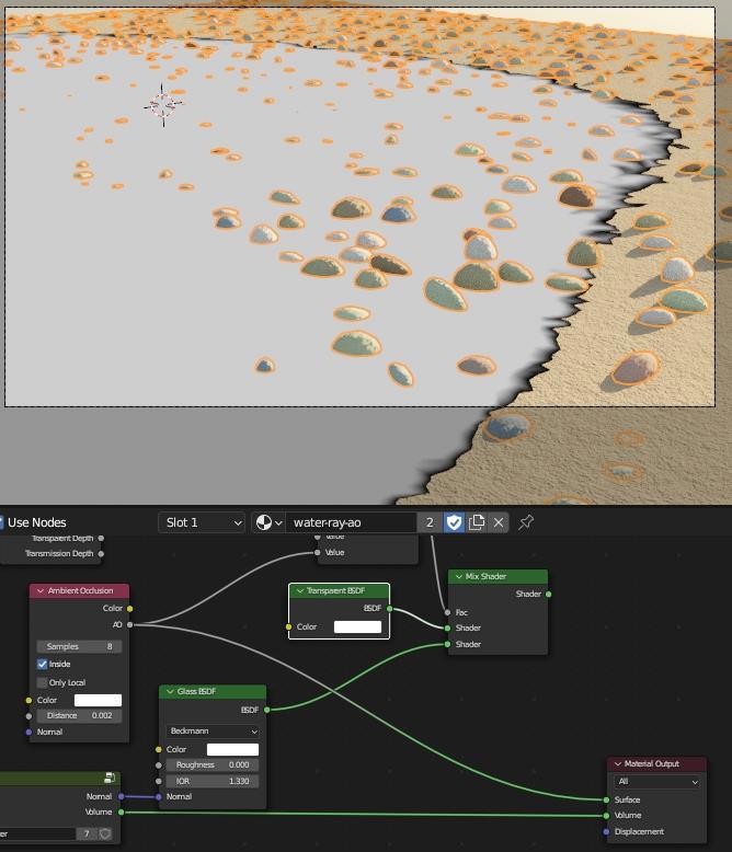 Воду я поместил вот в такую node group, тут задаются волны и нормали для них. Теоретически можно делать через displacement, но при покатой береговой линии волны будут там мешать, а снизить высоту displacement там не так-то просто. Ещё тут же задаётся шейдер volume - благодаря ему свет рассеивается и затухает в толще воды. И, собственно, основная проблема из-за него, если вы рисуете воду без volume шейдера, то cycles сам по себе делает воду более-менее нормально.