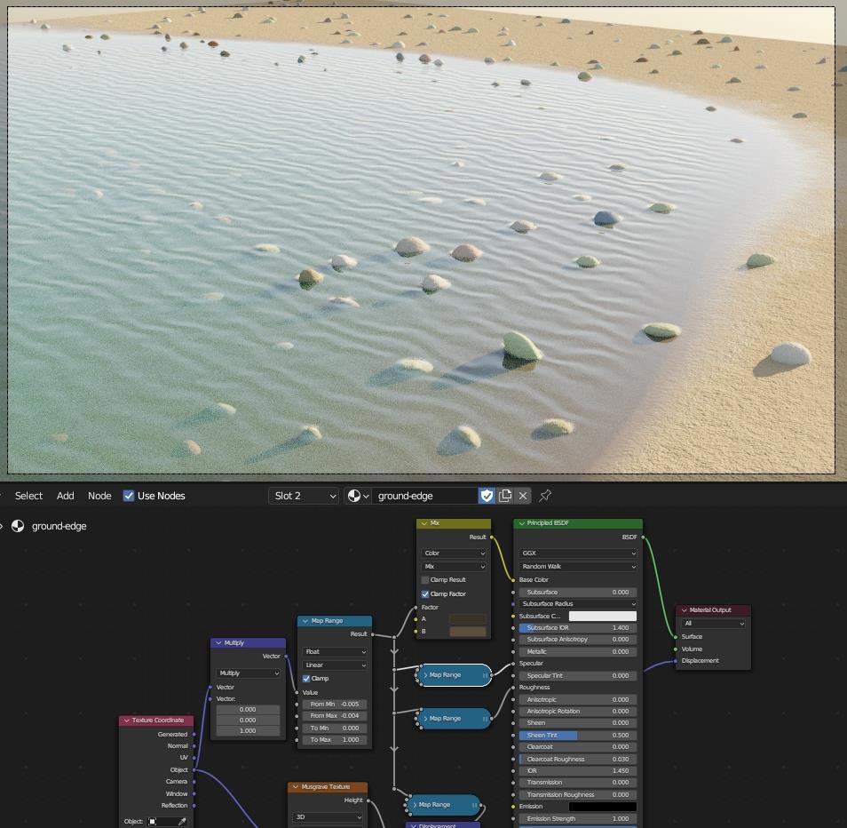 Тут очень примитивный костыль - в шейдере берётся вертикальная координата и если она меньше какого-то значения, то мы считаем, что "рядом вода" (здесь граница задается через map range), а если водя рядом, то цвет темнее, шероховатость ниже, блеск выше, ну и displacement прикручиваем. Результат на скрине выше.
