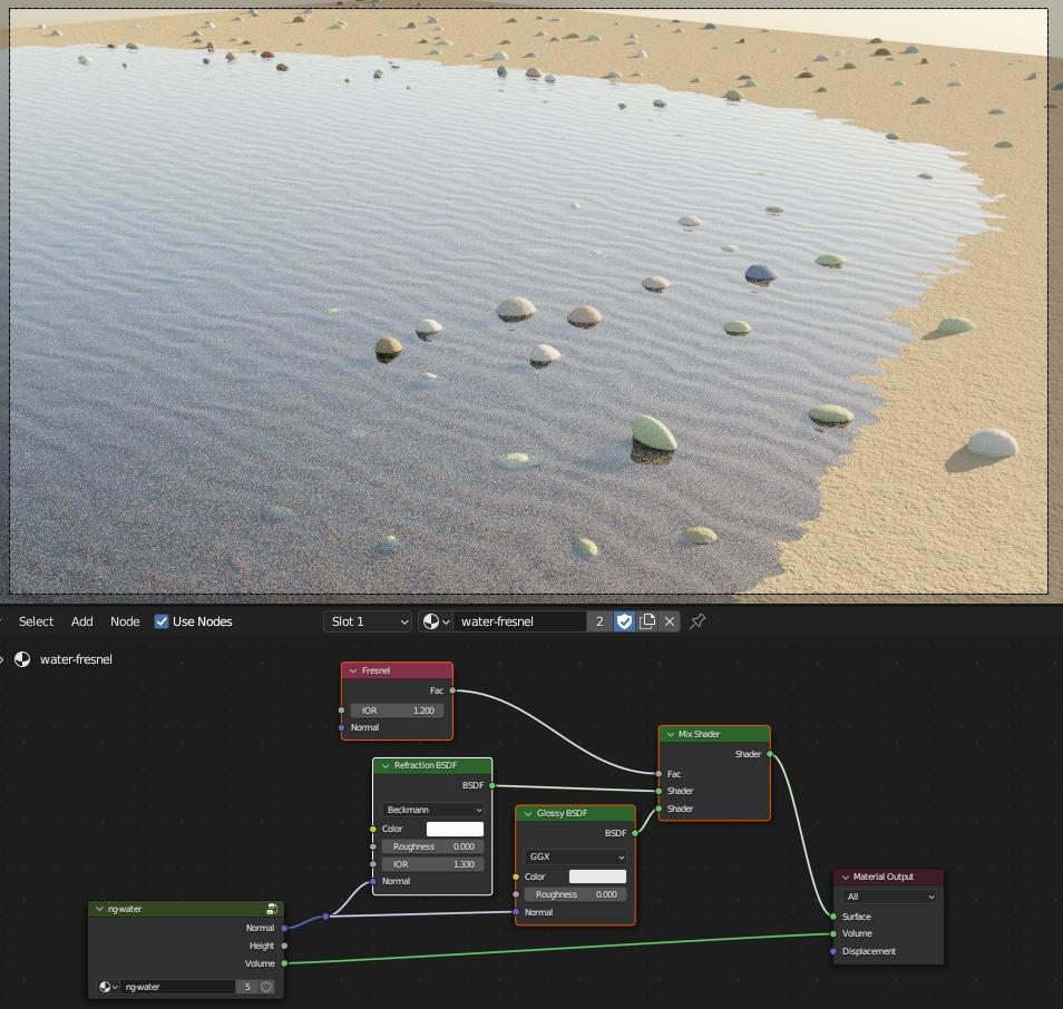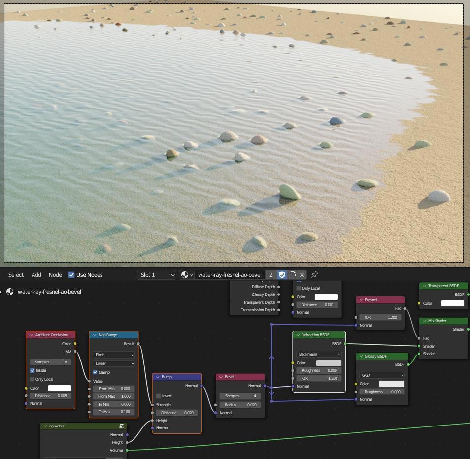 Теперь я собрал всё это вместе. Вместо glass взял его аналог с fresnel", чут ьснизил высоту волн к краям (вторым ambient occlusion), а заодно у refraction сделал серый цвет, чтобы толща воды сильнее затемнялась (это можно достичь и иными путями):