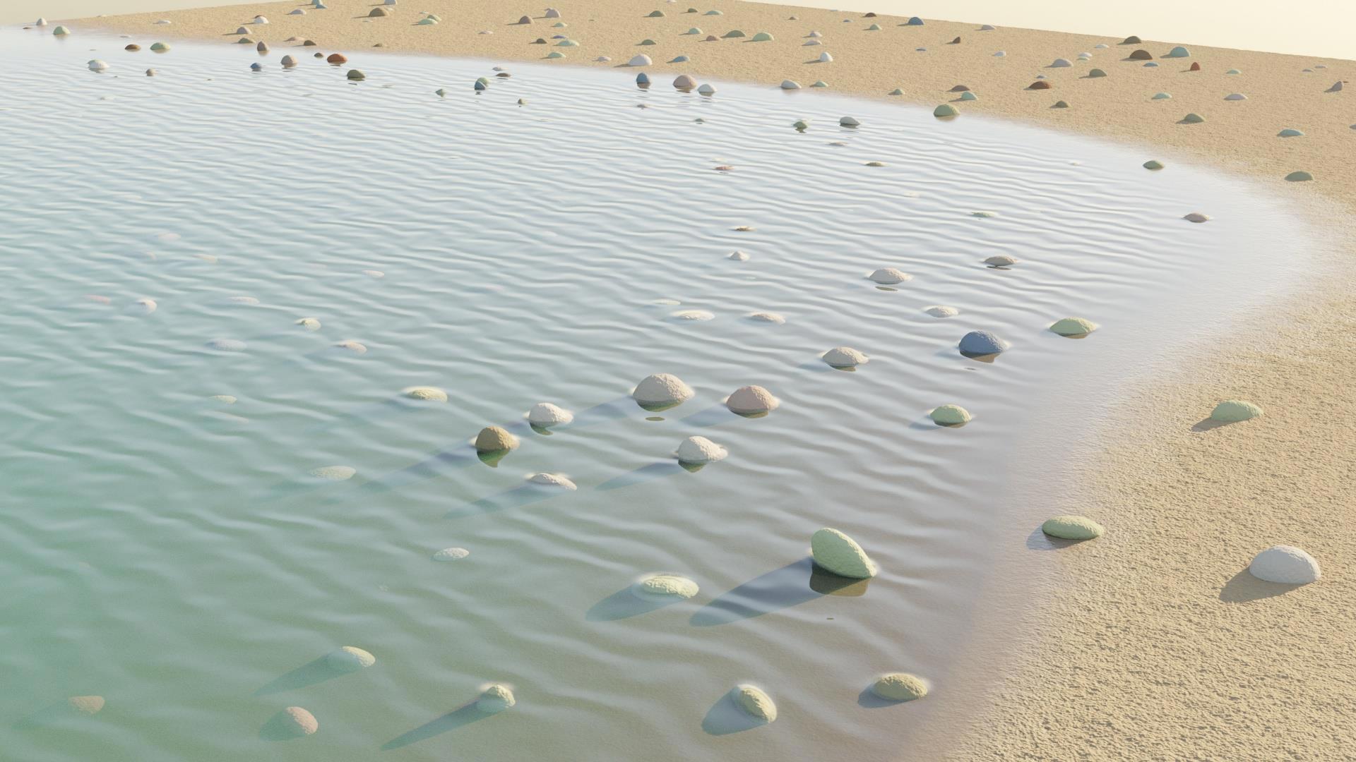Она далека от естественности, но уже не столь угловата, да и вообще. Тут надо отметить, что ещё камни торчат как-то внезапно и резко, хотя поверхность воды должна чуть изгибаться, из-за поверхностного натяжения.