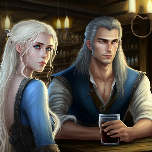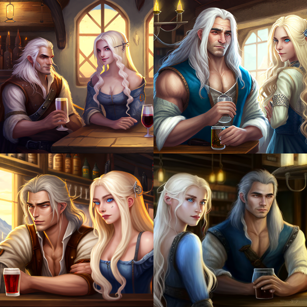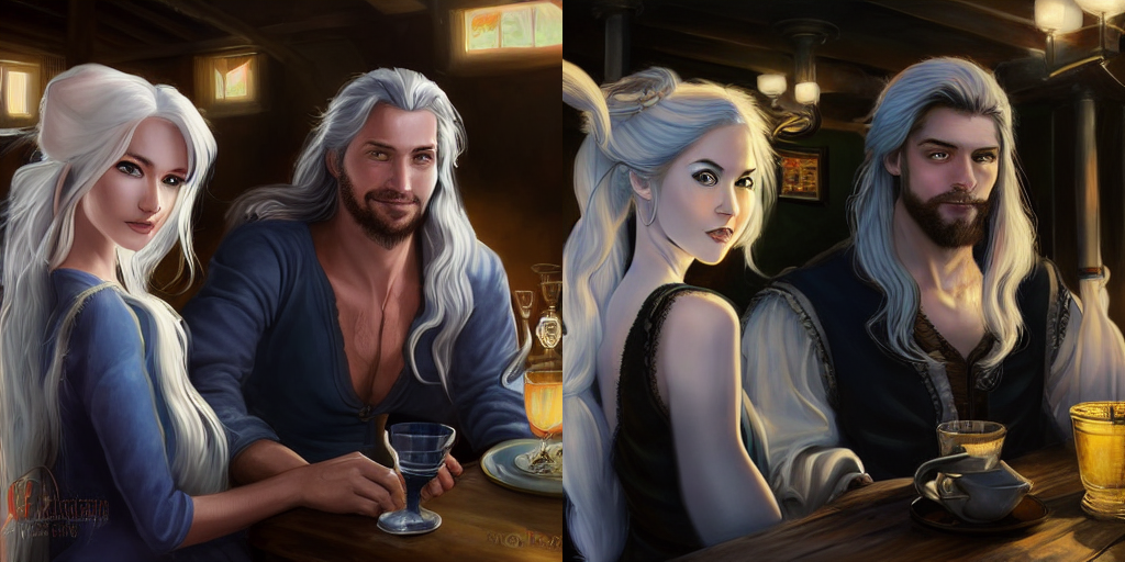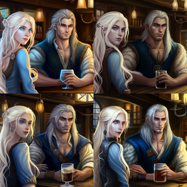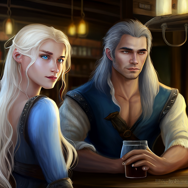 И так отправив боту такую фразу на английском "young man and woman with long white hair and blue eyes, tavern on the background, fantasy style, realistic".