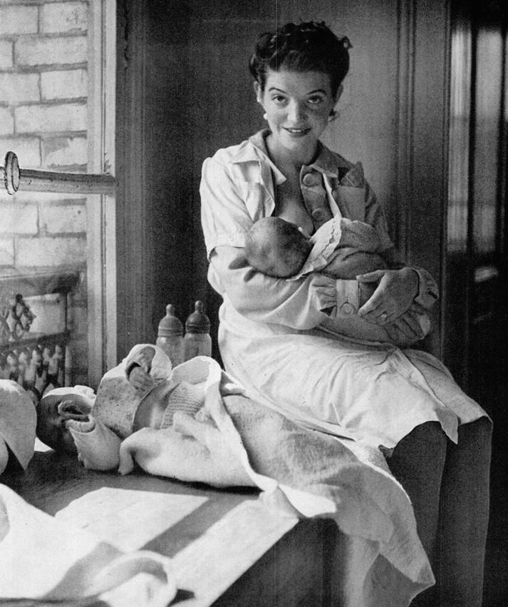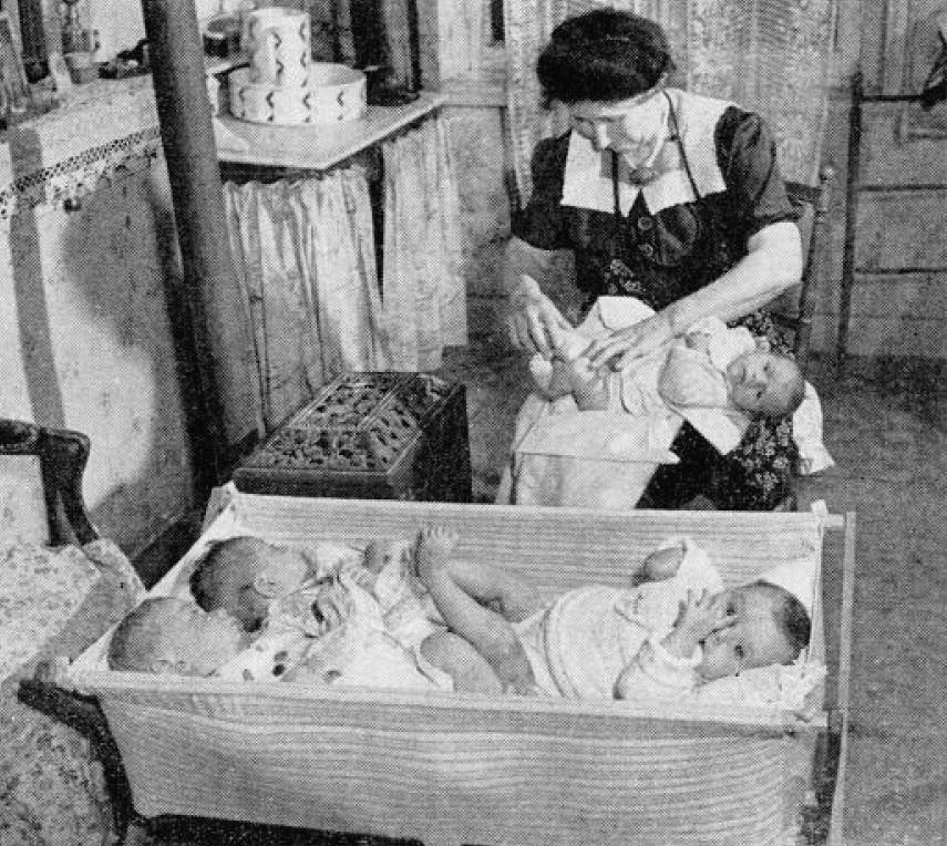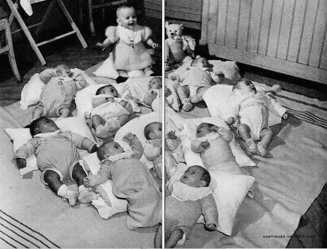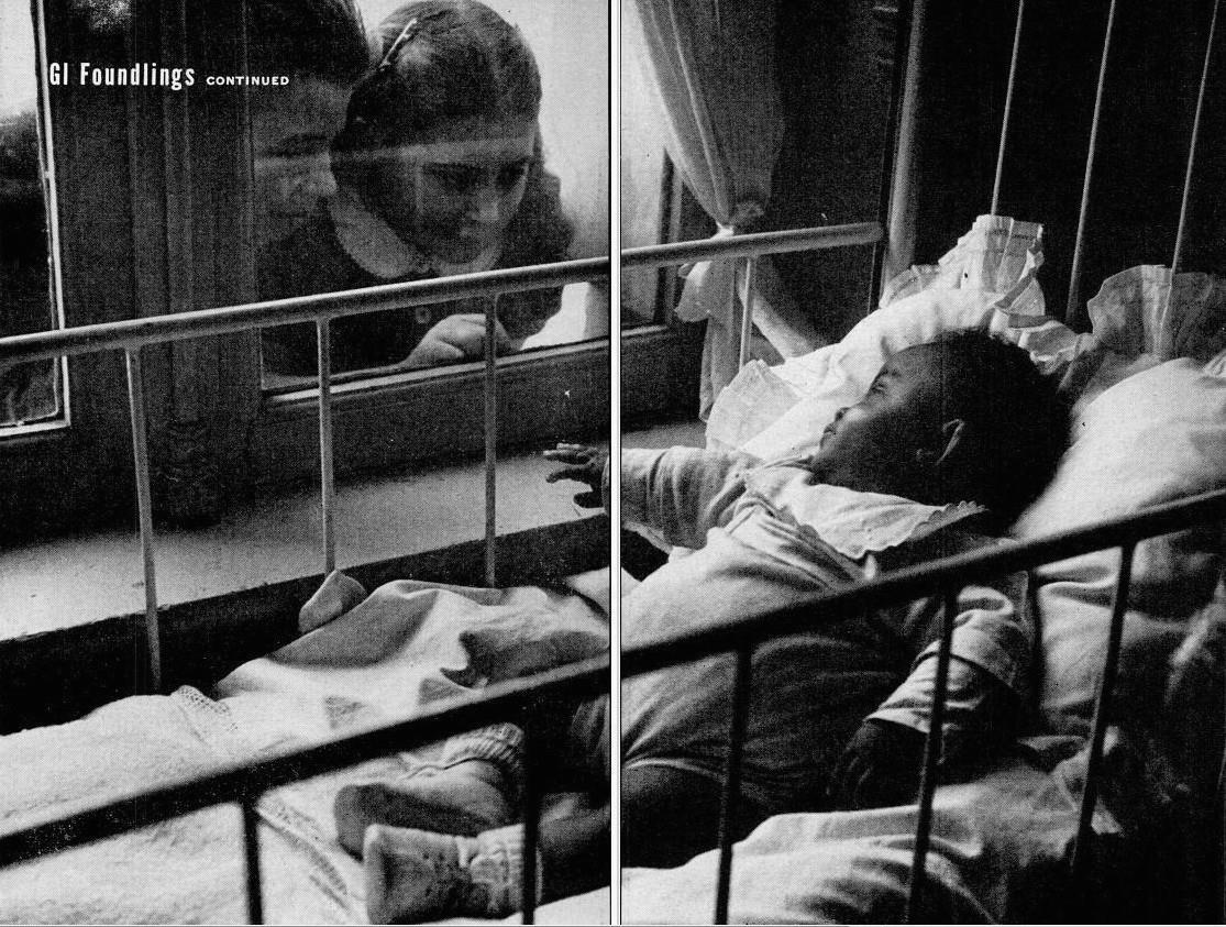 У ОДИННАДЦАТИ ДЕТЕЙ ВОЙНЫ которые сейчас находятся в колыбели, все были американскими отцами. Самому младшему ребенку восемь дней (в пеленках, справа внизу). Старшая - Жаннет, девять месяцев, сидит сзади. Некоторые из приюта мадам Паради после этого остаются с матерями. Некоторые, однако, усыновляются французскими семьями.