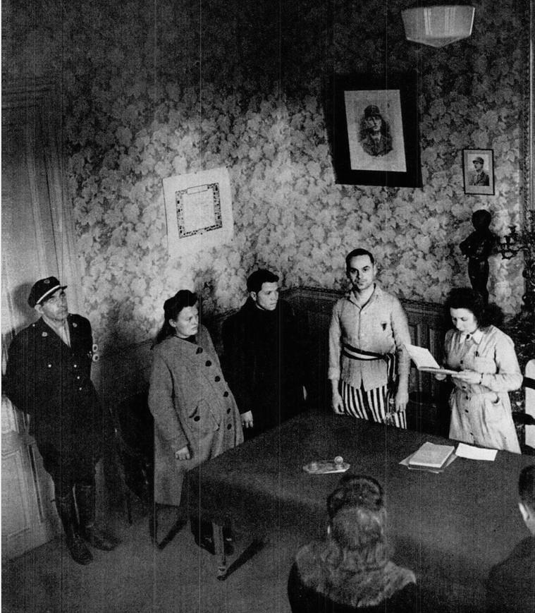 Мэр французского города Бруно Жан Даниэль провел военные годы в немецком лагере для военнопленных Бухенвальд. Он вспомнил об этом с непримиримой ненавистью, когда 29-летний французский солдат итальянского происхождения по имени Ахилл Никола подал заявление на получение разрешения жениться на немке, которую он привез с собой домой. В течение пяти месяцев мэр отказывался выдавать замуж французского солдата за немку. В конце концов государственный прокурор приказал ему сделать это. Ахилл привел свою невесту, Эльзу Гейслер, которая теперь была беременна, в мэрию, но когда они увидели мэра, то побледнели. На мэре под официальной одеждой была форма узника Бухенвальда, состоящая из полосатых брюк и серого пиджака с красной нашивкой с номером. После церемонии он сказал: "Вы узнаете этот полосатый костюм? ...У вас есть пожелания политического депортированного". Не целуясь, жених и невеста прошли сквозь презрительную толпу снаружи.