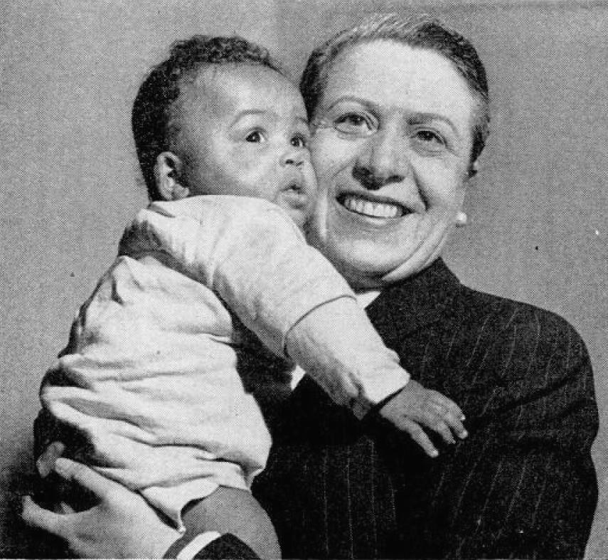 НЕГРИТЯНСКИЙ МАЛЫШ Патрик которым восхищается мадам Паради, . Приемных детей, Франсуа и Анну-Мари, оставила здесь мать, которая отдала их мадам Рай, когда ее муж-французский солдат вернулся из немецкого лагеря для военнопленных. Отец Патрика, который сейчас находится в Бруклине, надеется вскоре послать за своим сыном.