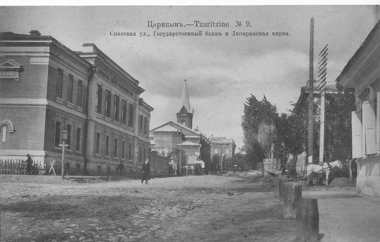Продвигаемся прямо по Астраханской дальше, удаляясь от Царицы. Это уже перекрёсток со Спасской (ныне улицей Володарского) - слева тогдашнее здание Госбанка, сохранившееся, хоть и сильно перестроенное, до современности. Оно заслуживает отдельной истории, поэтому я пока воздержусь писать о нём и выставлять его фотографии разных лет, выше по Спасской видна Лютеранская Кирха - https://author.today/post/140622 :