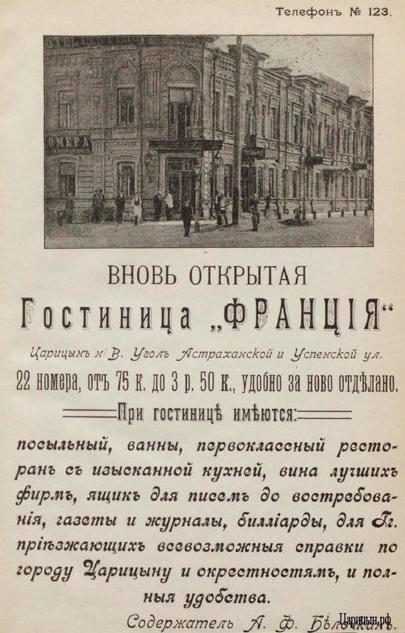 На пересечении Астраханской и Успенской находилась гостиница "Франция". Представляете объявление кондуктора в трамвае: "Следующая остановка - "Франция"!"? Впечатление, правда, что снимок уже двадцатых годов: табличку на доме не прочитать, но для Успенской надпись слишком короткая: скорее всего там уже "ул. Ленина", как перпендикулярная называется до сих пор: