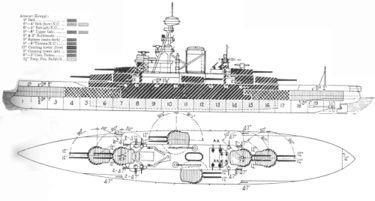 Образованная верхним поясом цитадель закрывалась сверху (на уровне верхней палубы) 38-мм броневой палубой (состоящей из двух 19-мм слоев). Вне цитадели поверх главного пояса шла плоская 51-мм броневая палуба.