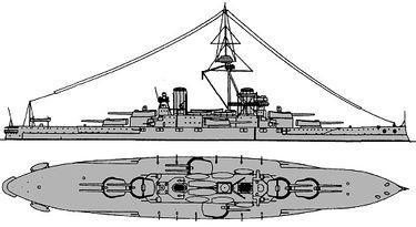 Корпус линкора был относительно низкий, гладкопалубный, без полубака. Корабль имел две трубы, сразу за носовой трубой располагалась фок-мачта. Между фок-мачтой и кормовой трубой были размещены средства спасения.