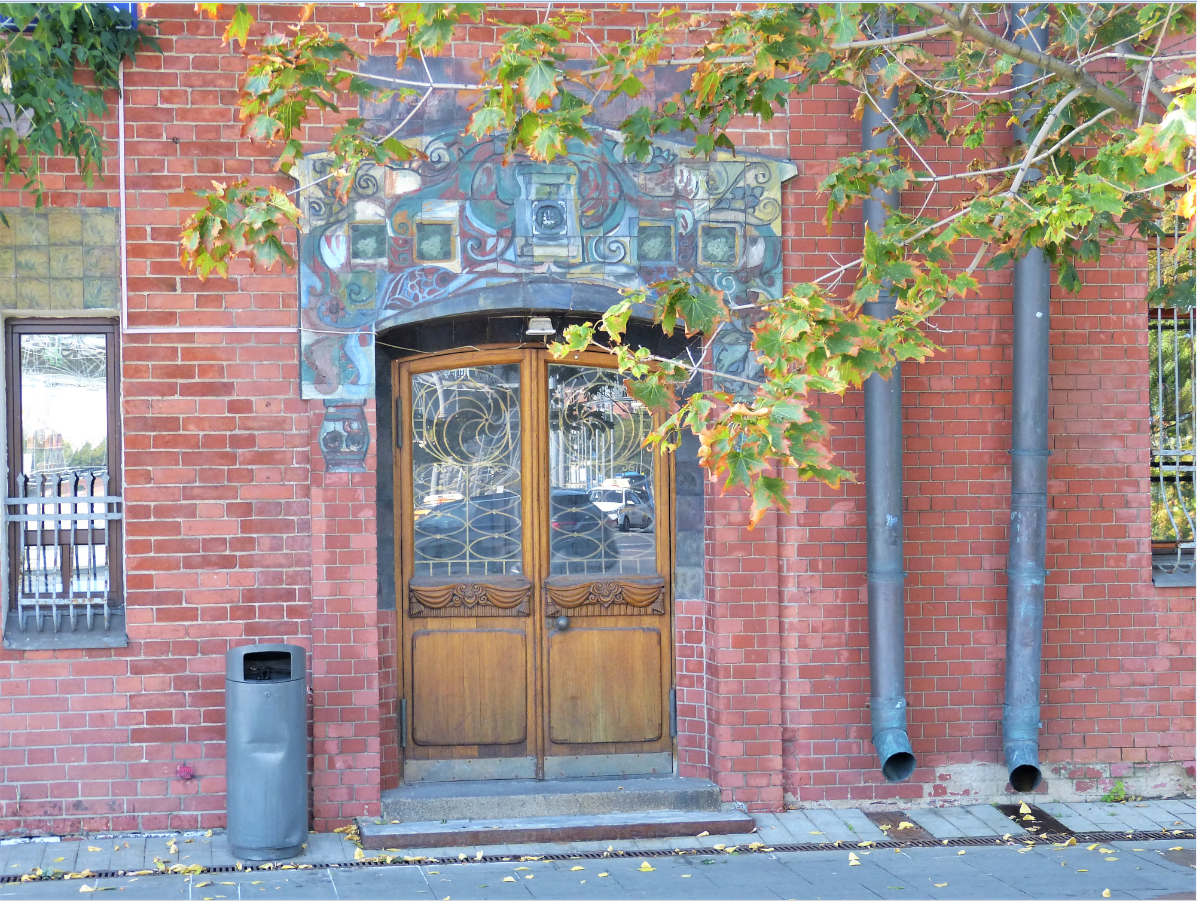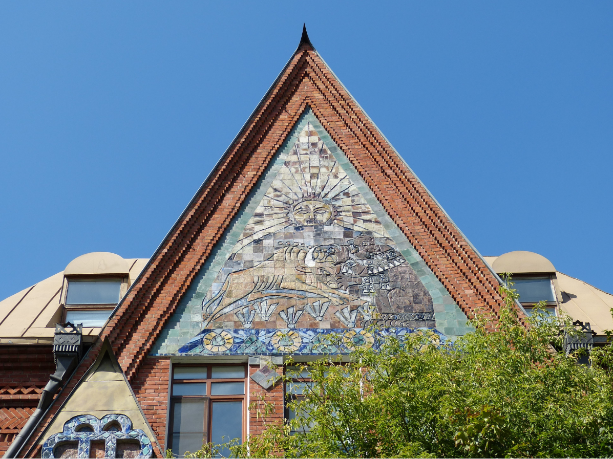 У дома очень красочный декор. Фасад украшают разнообразные панно из майолики, которые изготовили молодые художники Строгановского училища, объединившиеся в артель.