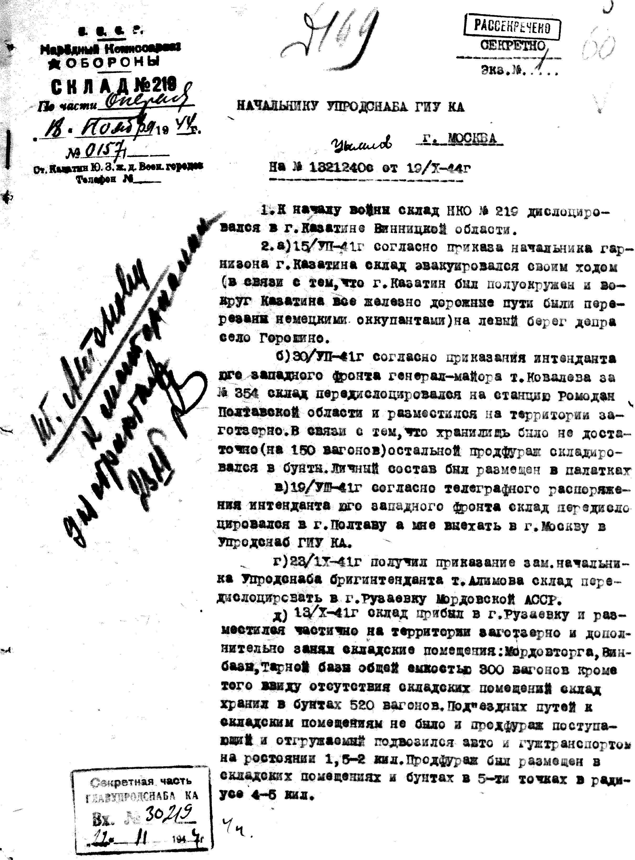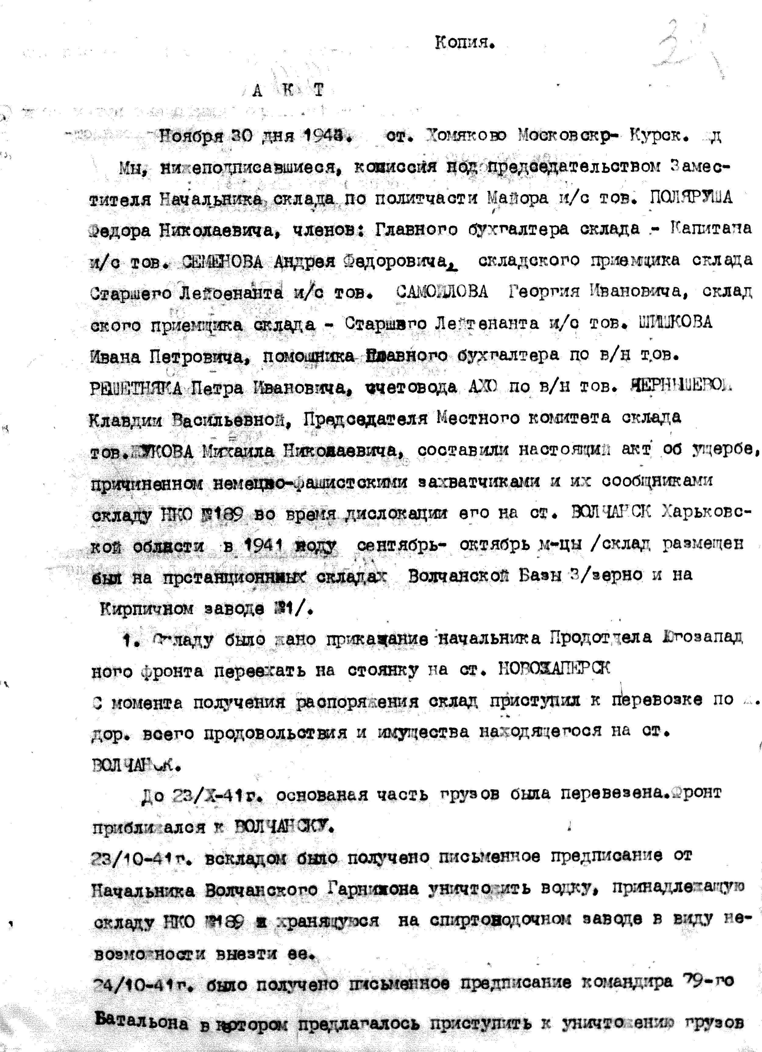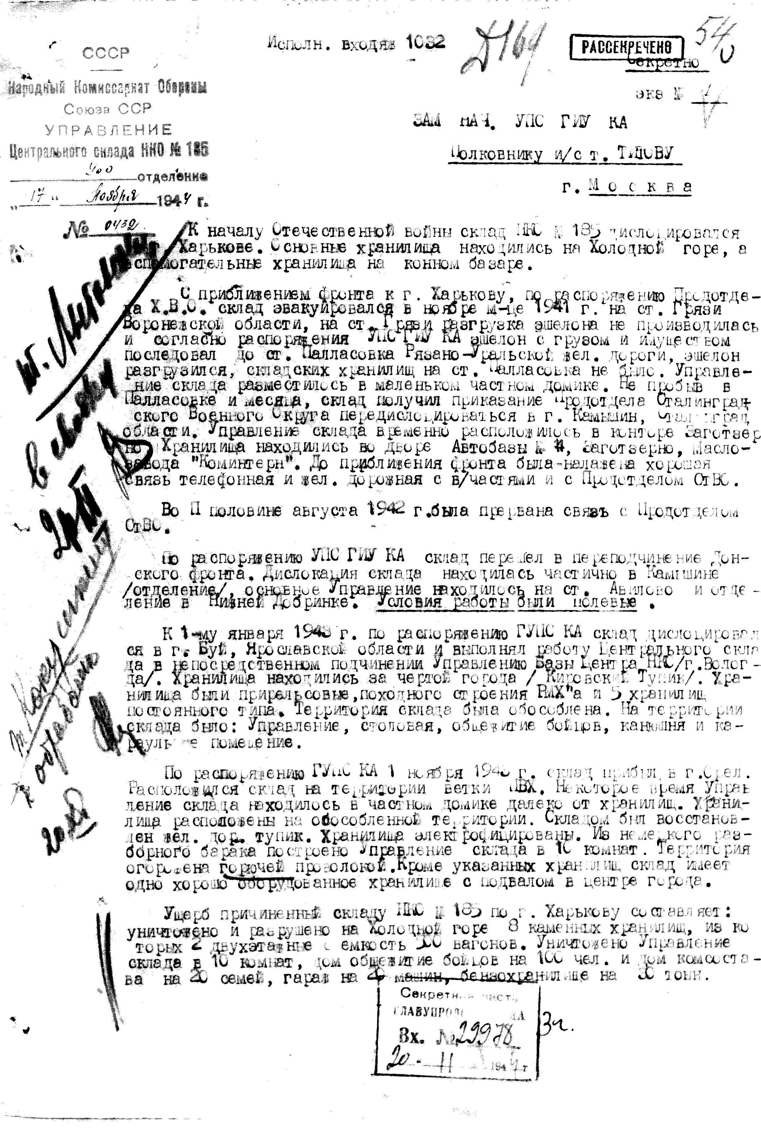 Неоднократно перемещался и размещавшийся до войны в Харькове 185 продсклад НКО. Всего три листа отчета, но и из них виден колоссальный объем работы, произведенный складскими сотрудниками.