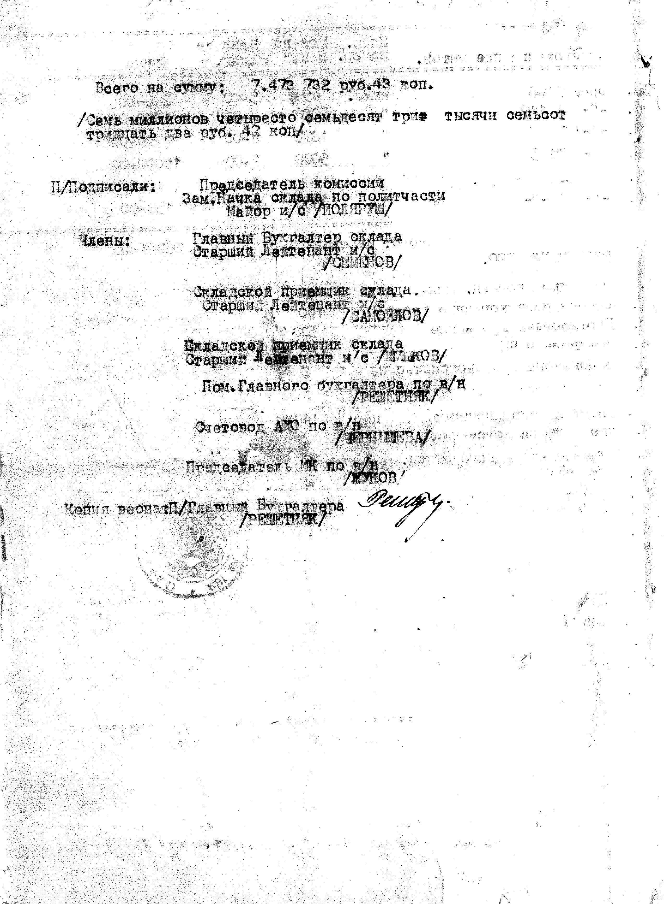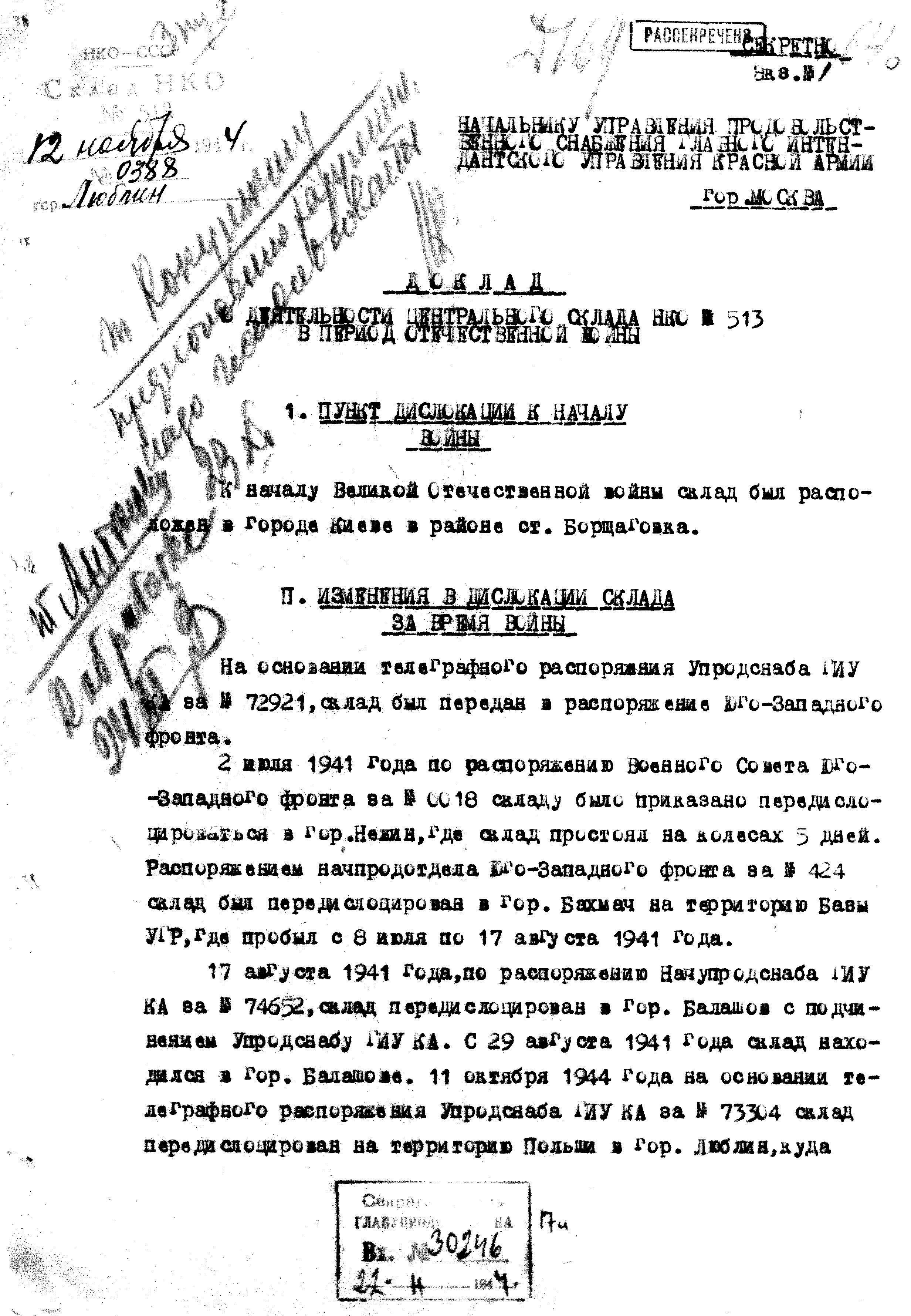 Пожалуй самый подробный отчет составил начальник 513 склада НКО. И вновь: бомбежки, эвакуация, пожары, даже упавший и взорвавшийся на территории склада самолет. И на фоне этого, необычно выглядит вполне мирная процедура - выдача подъемных зарплаты вольнонаемному персоналу.