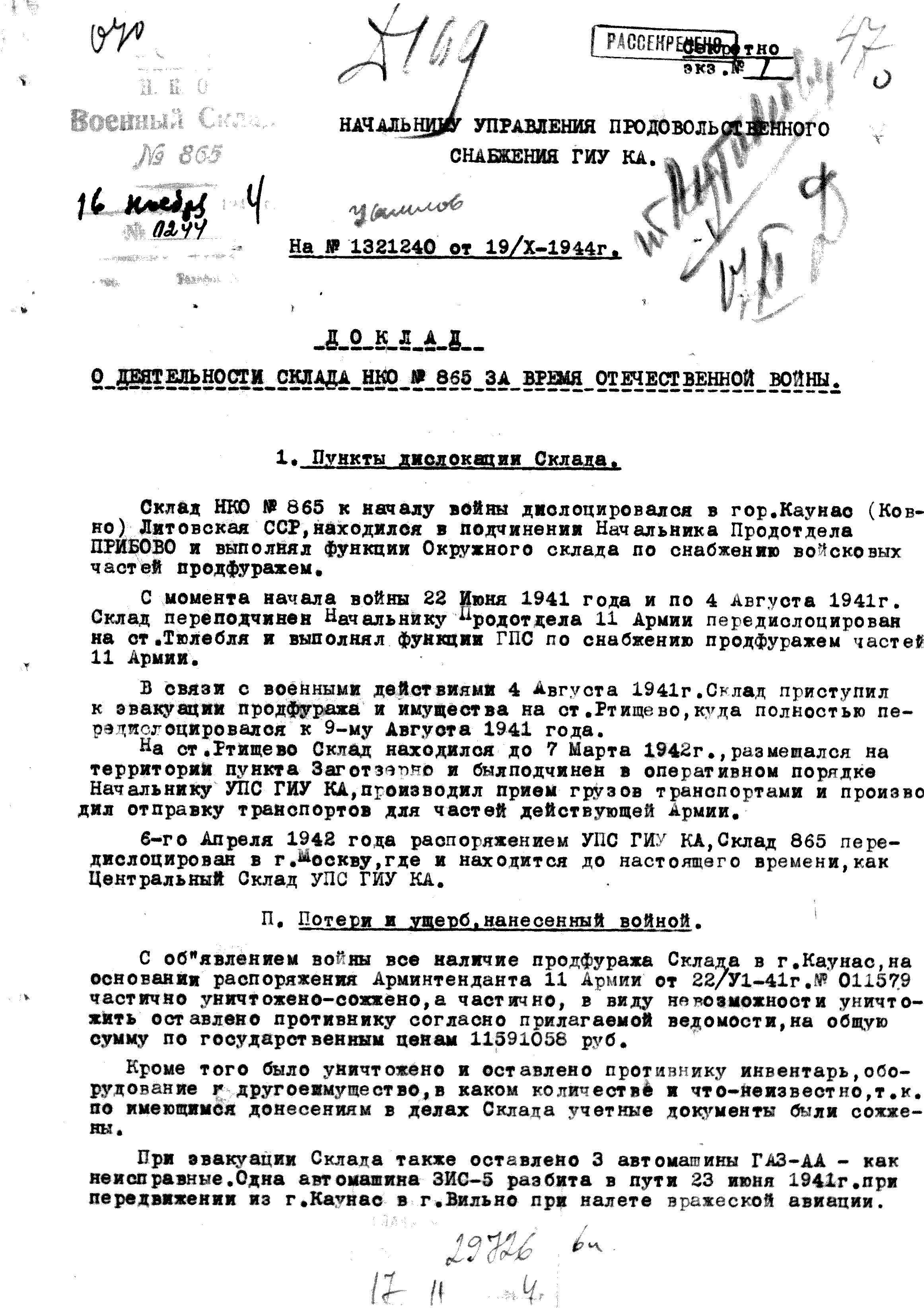 Складу № 865, пришлось передислоцироваться дважды: эвакуироваться из Каунаса и из Ртищево: