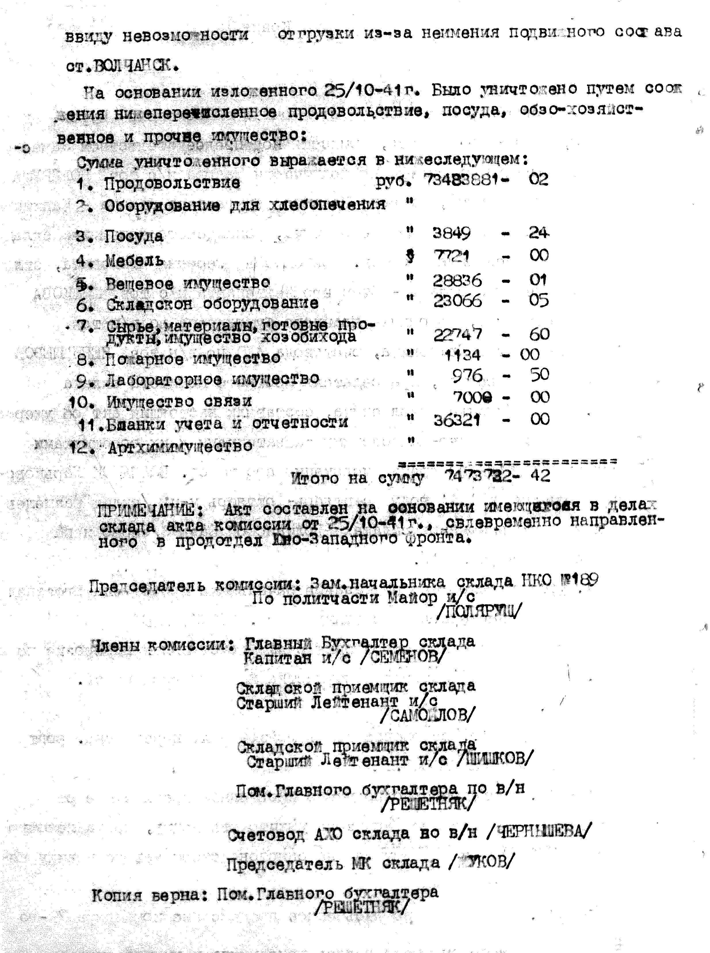 Вот, например, 189 продсклад НКО. Часть имущества смогли отправить, но кое-что оставалось. К тому же, поступил приказ, уничтожить водку, принадлежавшую НКО и хранившуюся на спиртзаводе.