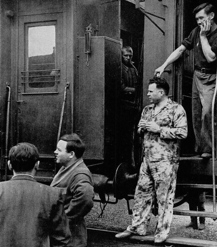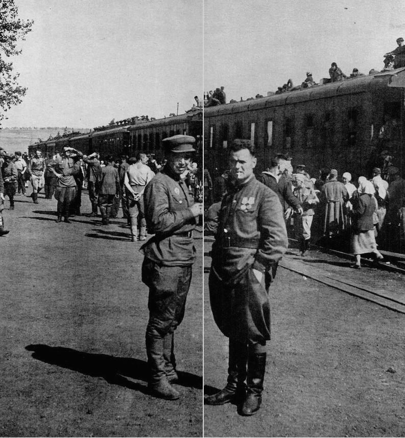 ДЕМОБИЛИЗОВАННЫЕ солдаты едут домой с Западного фронта в товарных вагонах. Лозунги, нарисованные на этом военном поезде, провозглашали: Слава нашему великому народу — народу победителю!