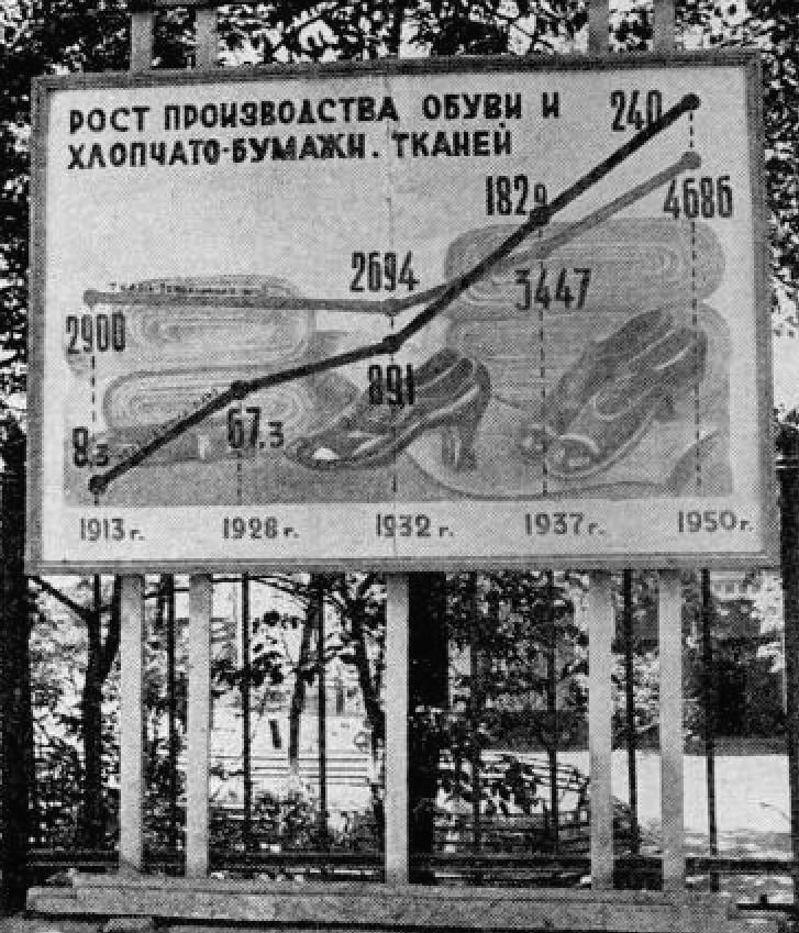 На главной улице Владикавказа рекламируется СТАЛИНСКИЙ ПЯТИЛЕТНИЙ план. Этот график показывает увеличение количества обуви.