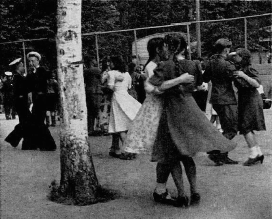 В ТАНЦЕВАЛЬНОМ павильоне на пляже звучит американский джаз. Моряки (слева) танцуют вместе, хотя это запрещено властями в единственном ночном клубе Владивостока.