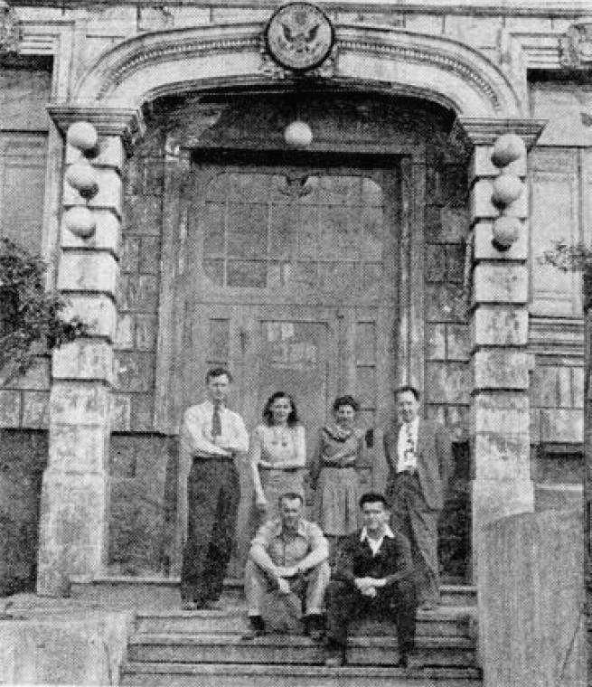 АМЕРИКАНСКАЯ КОЛОНИЯ во Владивостоке позировала для фотосессии перед консульством. Слева направо: (стоя) лейтенант-коммандер (соответствует званию Капитан 3-го ранга) Райан, два секретаря, вице-консул Смит; (сидят) коммандер (соответствует званию Капитан 2-го ранга) Руйяр, главный старшина Грейсон.