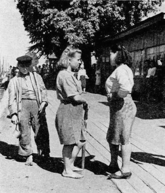 ДВЕ ДОМОХОЗЯЙКИ обсуждают погоду, хлебные пайки и медленный возврат потребительских товаров. Этот снимок был сделан на станции в Биробиджане, Еврейской автономной области на Дальнем востоке Сибири, основанной в 1925 году.
