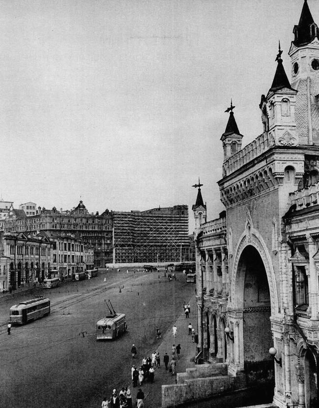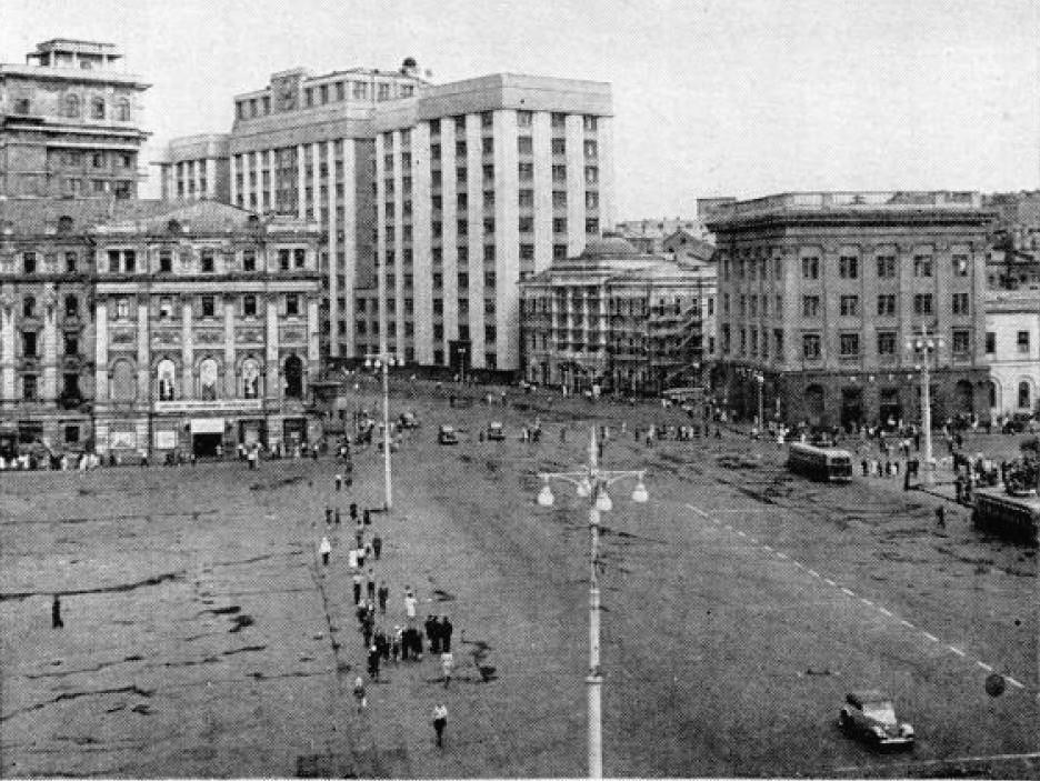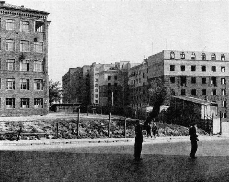 КВАРТИРЫ для РАБОЧИХ, наполовину законченные в 1941 году, спешно достраиваются, чтобы восполнить нехватку жилья в Москве, усугубленную удвоением населения города во время войны.