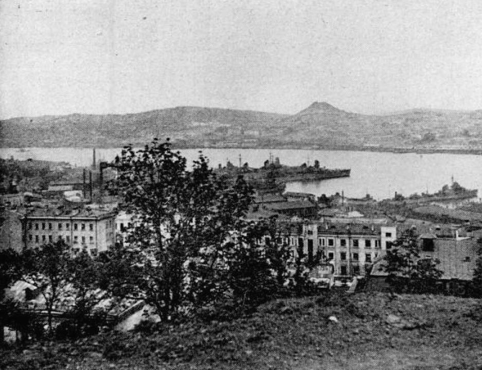 ВСЕПОГОДНАЯ ГАВАНЬ ВЛАДИВОСТОКА, ЗАКРЫТАЯ ОТ ОКЕАНА, ЗОЛОТОЙ РОГ, ЯВЛЯЕТСЯ ЯКОРНОЙ СТОЯНКОЙ ДЛЯ СУДОВ ВСЕХ РАЗМЕРОВ. ОНА ИМЕЕТ ЧЕТЫРЕ МИЛИ В ДЛИНУ И МИЛЮ В ШИРИНУ