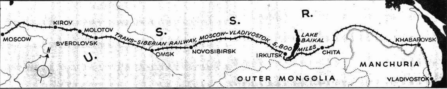 ТРАНССИБИРСКАЯ железная дорога охватывает одну четверть окружности земли. До войны самый быстрый, но наиболее уязвимый маршрут между Владивостоком и Москвой пролегал через удерживаемую японцами Маньчжурию. В 1938 году СОВЕТЫ сделали дальневосточный участок от озера Байкал до Хабаровска двухколейным, что делает его общесибирской линией.