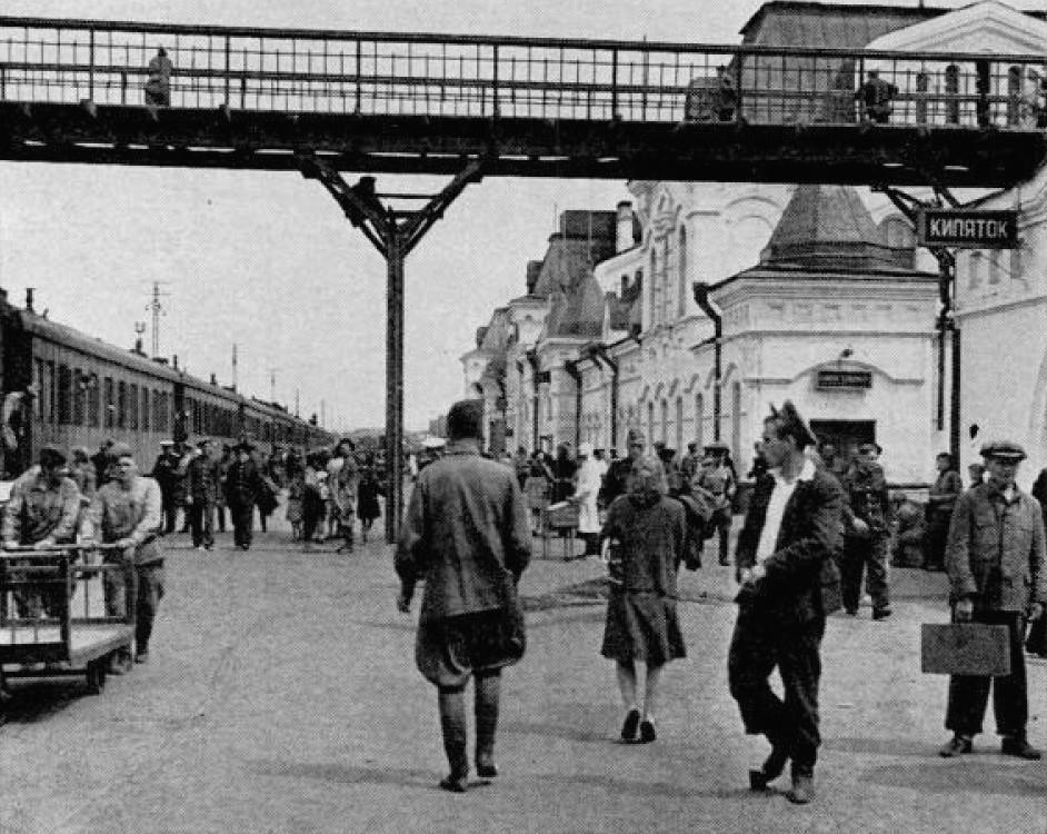 СИБИРСКАЯ ДЕРЕВНЯ Зиловно, расположенная между Читой и озером Байкал. это типично для приграничных поселений, которые пылятся вокруг железнодорожной линии на Дальнем Востоке. Дороги немощеные, деревянные дома некрашеные, жизнь людей довольно унылая по американским или западно-советским стандартам. Небольшой рынок на переднем плане находится достаточно близко к железнодорожному вокзалу, чтобы пассажиры могли купить кислое молоко, рыбу, птицу, овощи, орехи и ягоды по разумным ценам. В поезде был вагон-ресторан, но еда в нем, состоящая из икры, стейка, овощей, картофеля и бутылки водки, стоила 60 долларов на двоих. Единственными постоянными клиентами были демобилизованные офицеры, которые получили свое жалованье единовременно. Другие путешественники, которые привезли с собой из Владивостока колбасу, хлеб и сардины, купили остальную еду у жителей деревни. Жители деревни, в свою очередь, набились в вагон-ресторан со своими накопленными сбережениями, чтобы купить предметы роскоши, которые они, очевидно, никогда не покупали в местных магазинах. На некоторых станциях две официантки-блондинки в белых куртках вышли из вагона-ресторана, чтобы продать маленькие кусочки шоколада по пять рублей. Одни и те же девушки ходили по поезду, продавая суп и компот в нечетные часы. Советское правительство вполне удовлетворено этим соглашением, которое представляет собой своего рода легальный черный рынок, высасывающий избыточную покупательную способность.