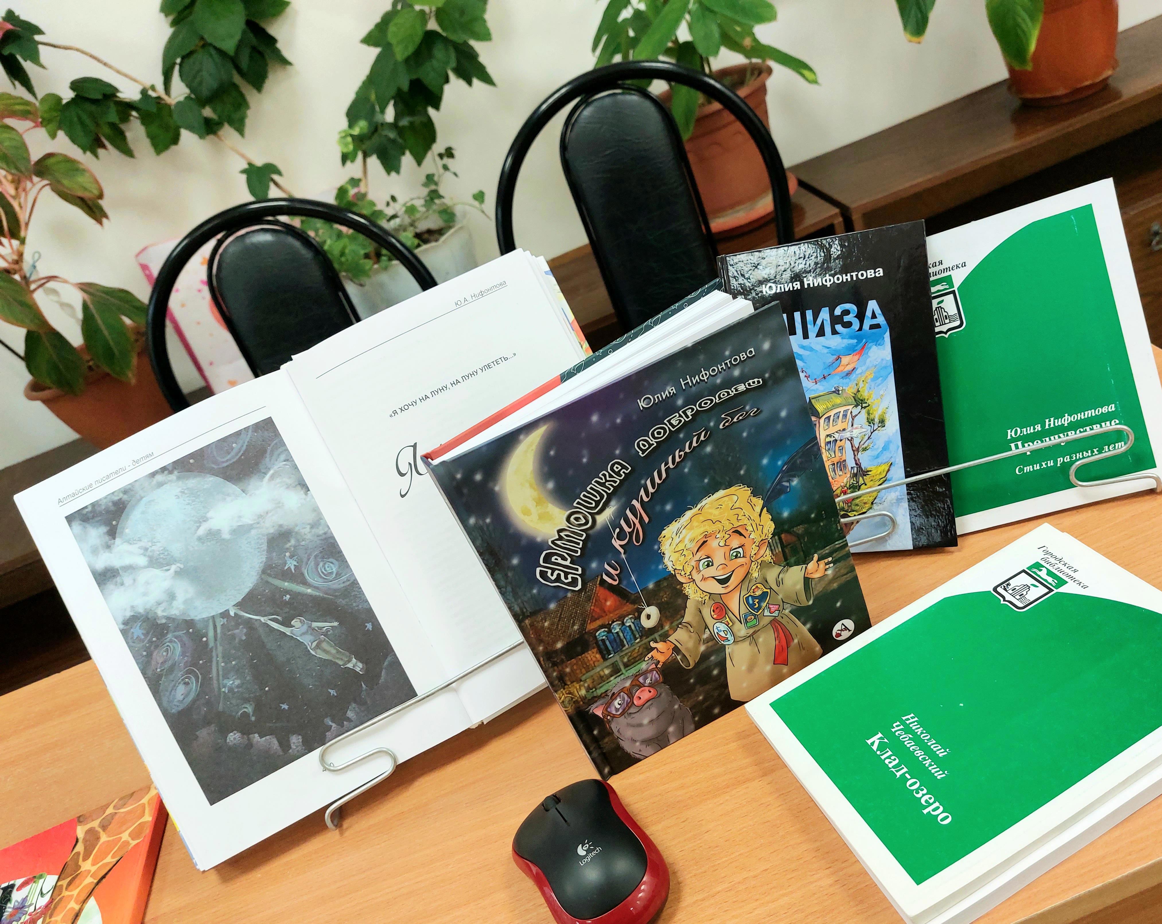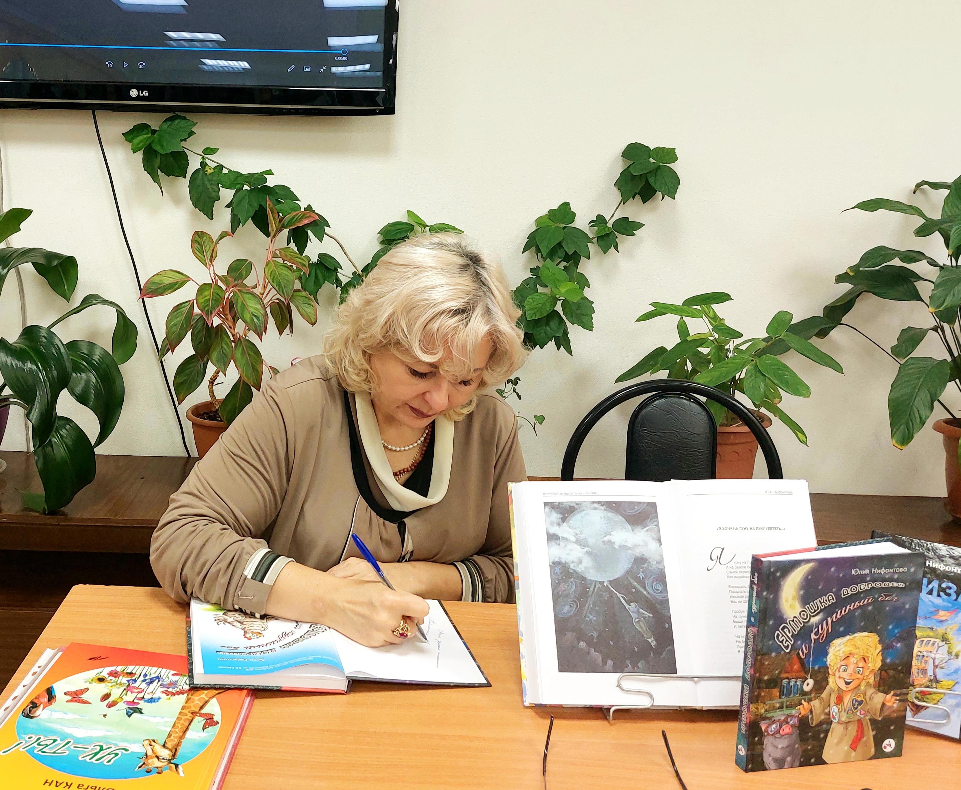 Добрая хозяйка библиотеки МБОУ "Лицей № 101" - Валентина Михайловна отлично организовала встречу и даже приготовила небольшую книжную выставку с моими произведениями, а это для автора всегда очень приятно!