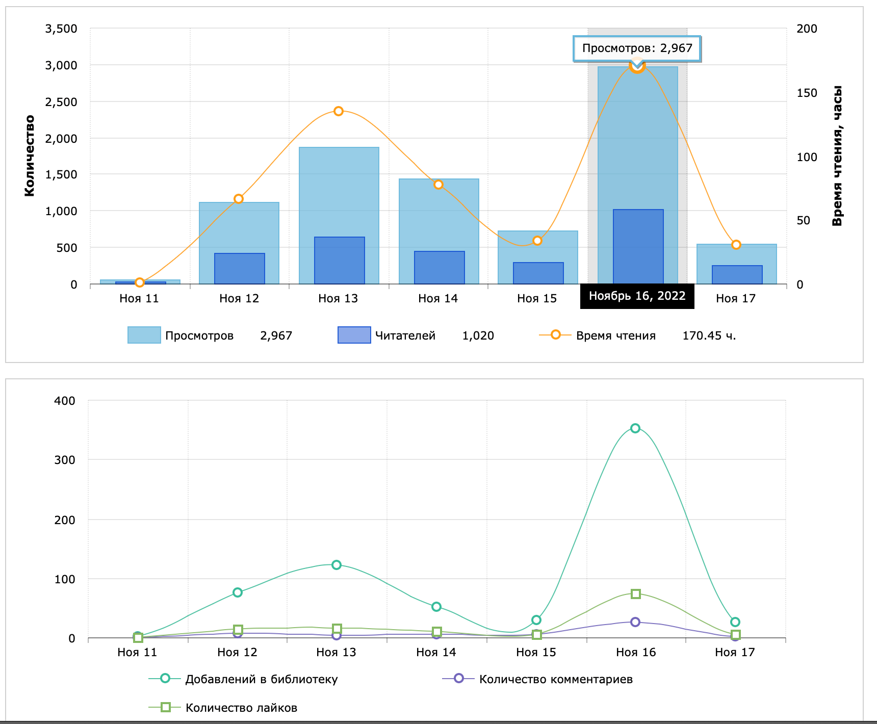 В общем, прошли сутки. Добрые люди подсказали, куда смотреть. Так что вот, скрин с внутренней статистикой сайта.