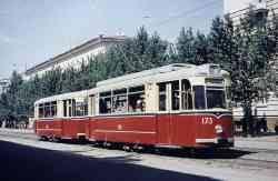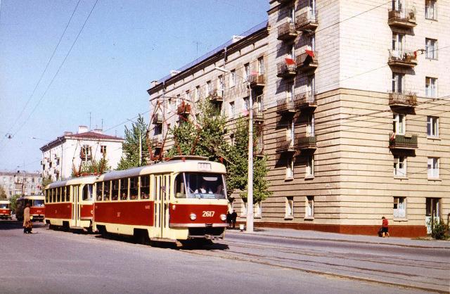 В девяностых трамвая на Советской уже нет (пути демонтированы в 1984) - справа дом по Аллее Героев 4: