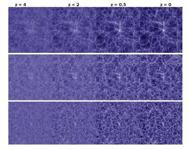 Эволюция крупномасштабной структуры во Вселенной, от раннего однородного состояния до кластеризованной Вселенной, которую мы знаем сегодня. Тип и обилие темной материи создали бы совершенно иную Вселенную, если бы мы изменили то, чем обладает наша Вселенная. Обратите внимание, что во всех случаях мелкомасштабная структура возникает до того, как возникает структура в самых больших масштабах, и что даже самые малоплотные области из всех все еще содержат ненулевые количества вещества.