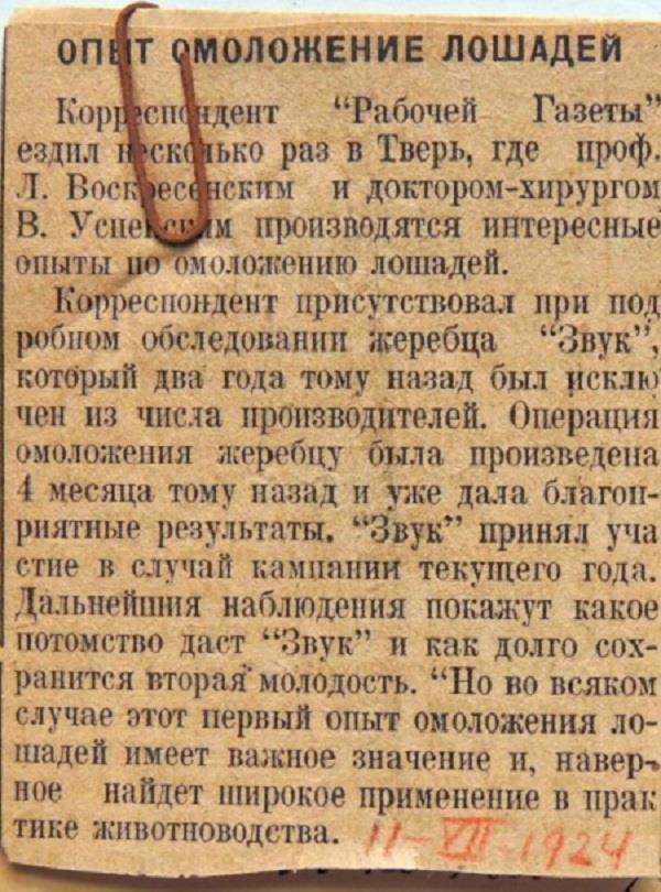 Поэтому в заметке нашлось место и тарантасам, извините, лошадям: "старый дряхлый жеребец, который почти не вставал на ноги после операции по омоложению стал способен для верховой езды, вновь скачет галопом".