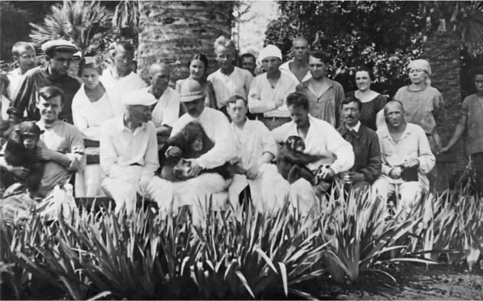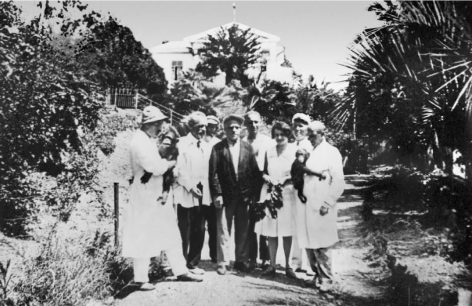 Вот Н. А. Семашко (в центре) с сотрудниками Сухумского питомника обезьян. Л.Н. Воскресенский слева.