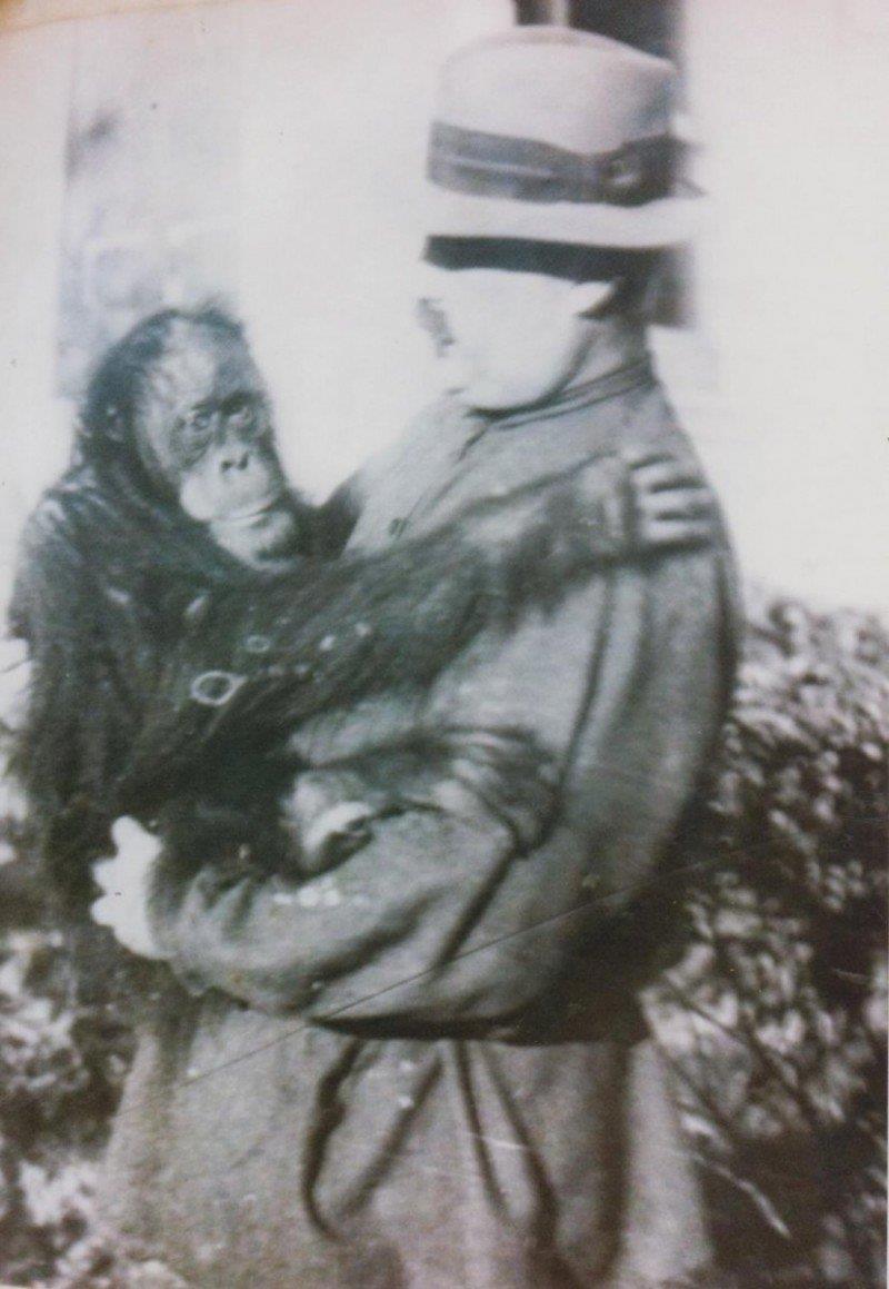 А вот групповое фото. Сидят, слева направо - сын писателя Максим Горький с шимпанзе, Алексей Максимович Горький, профессор Леонид Николаевич Воскресенский с орангутангом.