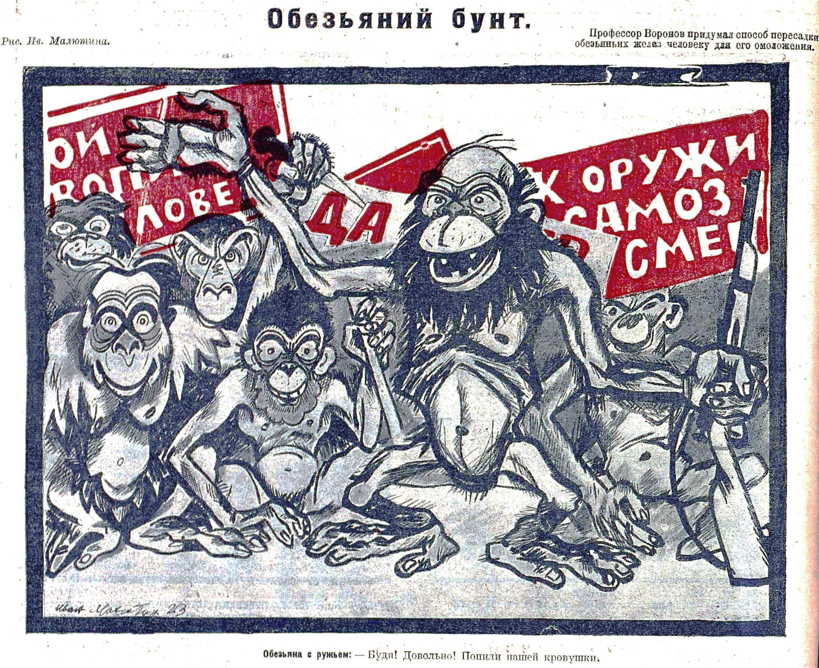 Поэтому тема с омоложением была очень популярна. Не успел "Крокодил" опубликовать карикатуру Ивана Малютина "Обезьяний бунт",