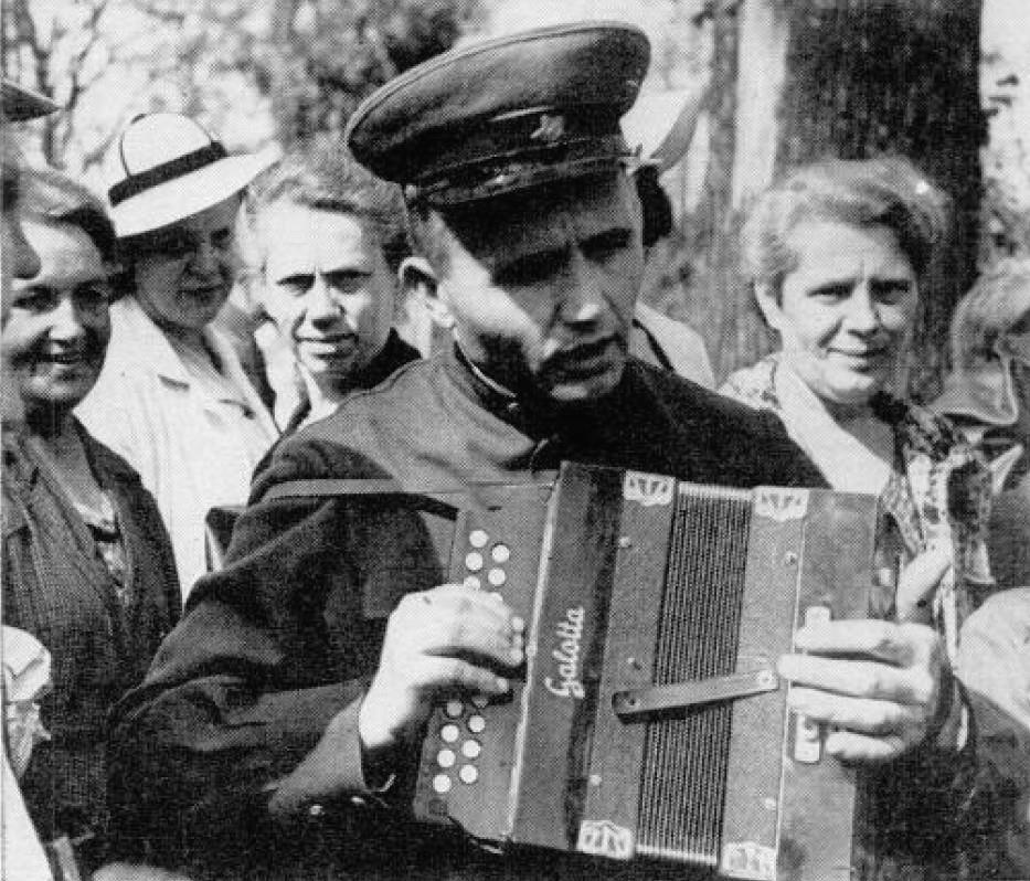 Дешевый аккордеон опробован русским солдатом перед покупкой. Русские девушки-солдаты примеряют поношенные платья.
