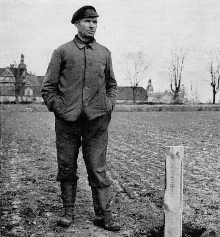 СИЛЕЗСКИЙ ФЕРМЕР извлек выгоду из российской земельной реформы. Здесь он стоит рядом со столбом, отмечающим 20 акров, выделенных ему из земель, окружающих замок Забельтиц (видно на заднем плане).Крестьяне покупают свою землю, затем у них есть до 20 лет, в течение которых они должны платить.