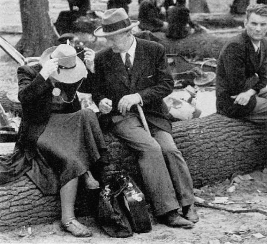 Хорошо одетая пара сидит на бревне в Тиргартене, ожидая обмена некоторых своих личных вещей на наличные или товары. Женщина снимает с шеи цепочку, чтобы предложить.