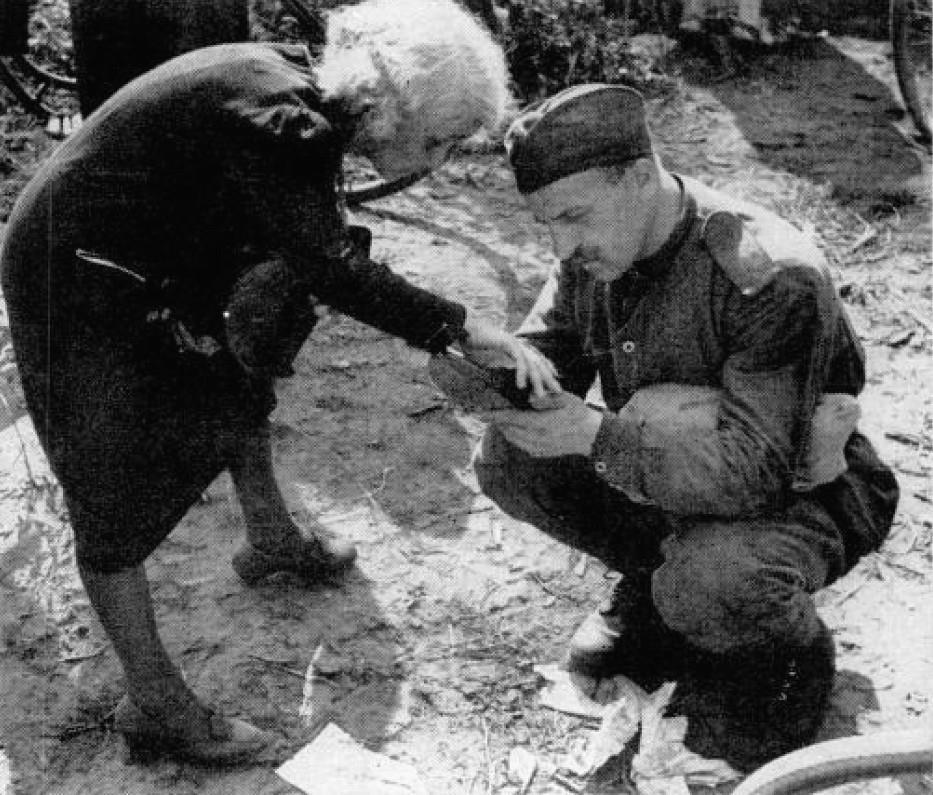 Новенькую обувь, предложенную немкой, осматривает русский рядовой.