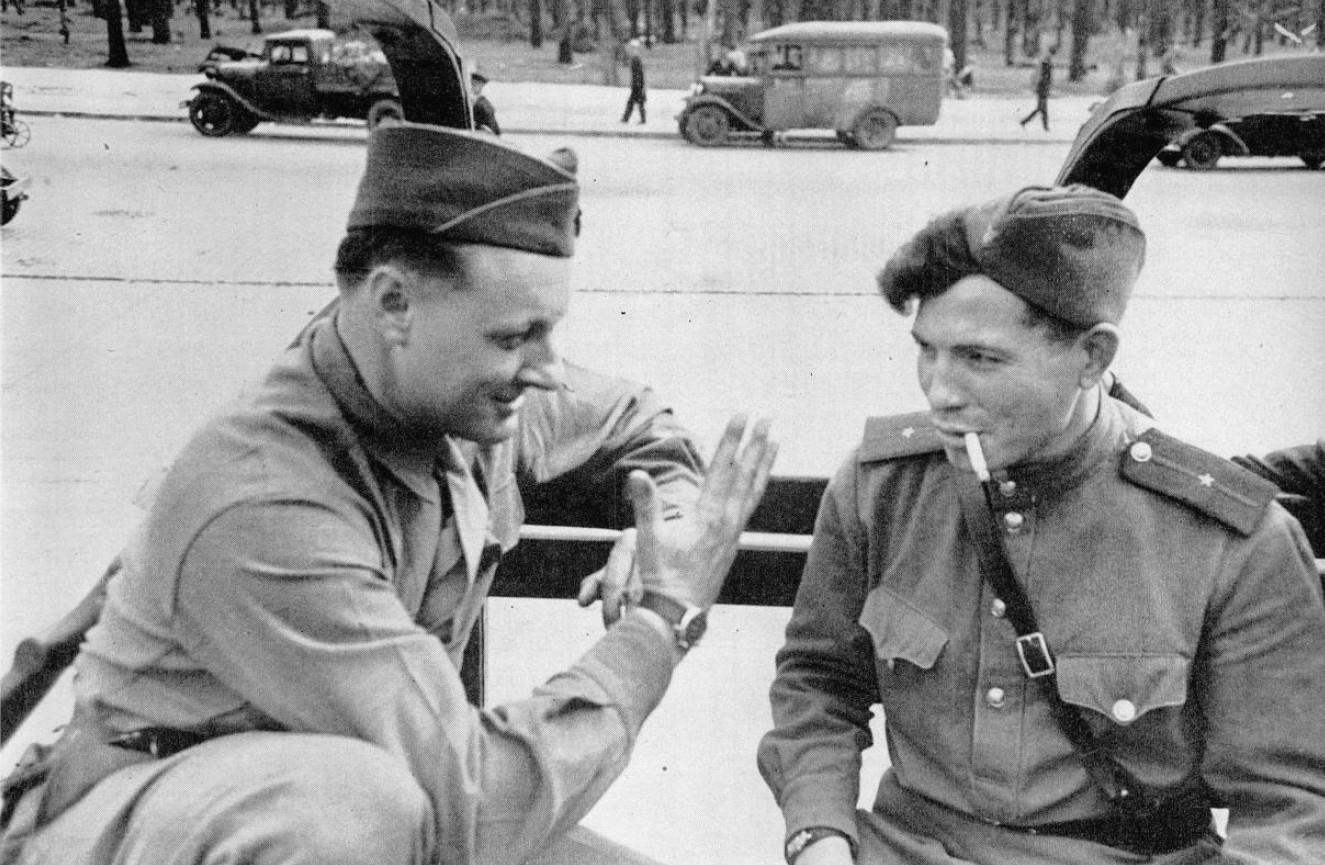 Русский офицер тайком высовывается из кузова грузовика Красной армии, проезжающего через Тиргартен, чтобы поторговаться с женщиной за бутылку немецкого вина.