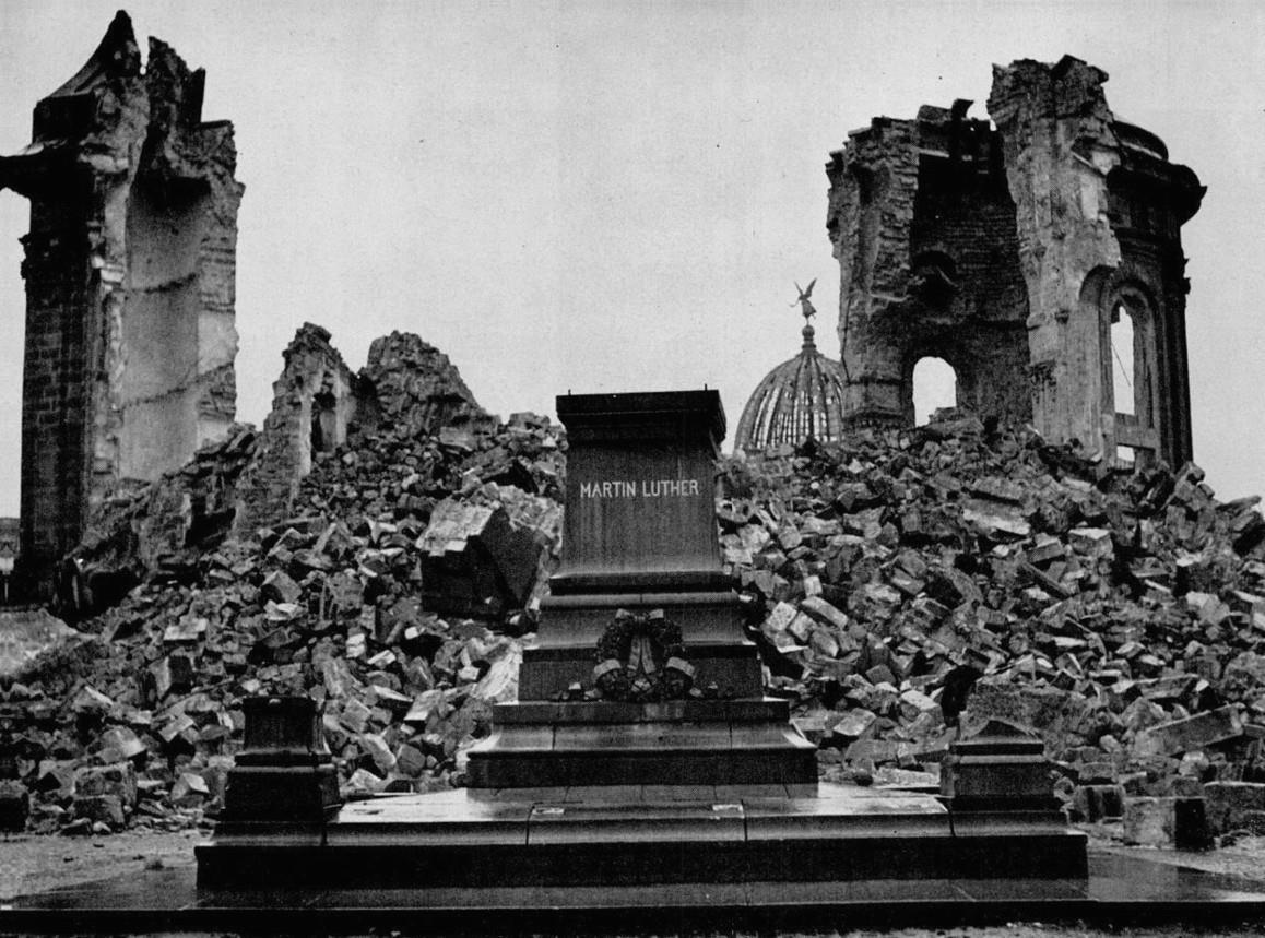 НЕКОГДА ВЕЛИЧЕСТВЕННАЯ ФРАУЭН-КИРХЕ, ОДНА ИЗ ВЕЛИЧАЙШИХ ПРОТЕСТАНТСКИХ ЦЕРКВЕЙ ГЕРМАНИИ. ЛЕЖИТ В РУИНАХ В ДРЕЗДЕНЕ. СТАТУЯ МАРТИНА ЛЮТЕРА ПОКИНУЛА ПЬЕДЕСТАЛ