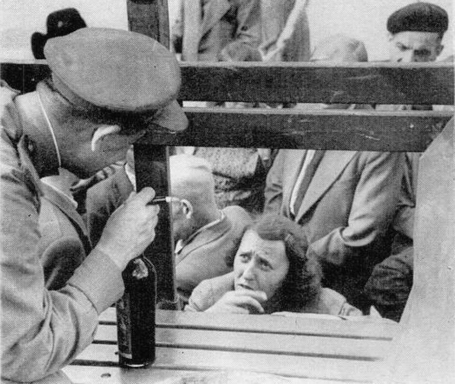 Двое полицейских и человек в штатском, уводят гражданского с окровавленным носом с черного рынка после рейда. Он был арестован за ношение оружия и отсутствие документов.