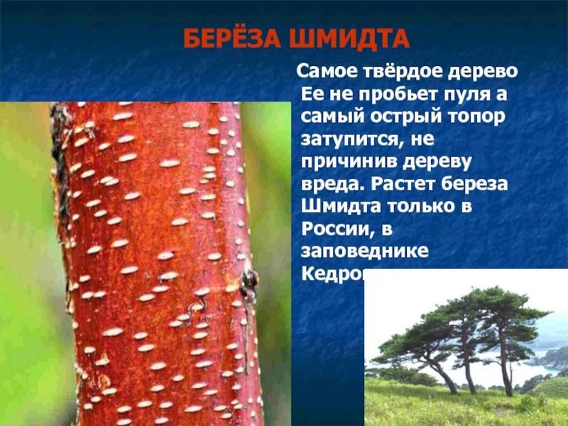 N.B. Когда-то моим соседом был один хороший человек, который был потомственным лесником. Его дом стоял на участке, который был раз в десять больше нашего. И прямо напротив окна из нашей комнаты, которая считалась библиотекой росло очень большое и красивое дерево. Это дерево росло на его участке. Я очень удивился, когда узнал, что это дерево было меднокожей березой. Оказывается берез больше ста видов. Есть и черные и медные и белые и многие другие. В том числе и уникальная береза Шмидта, которая имеет необыкновенно твердую древесину.