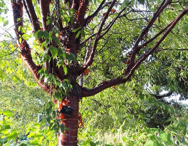 Это дерево имеет темно - красно - коричневый, с бордовым отливом цвет коры, похожий на ствол вишни, благодаря чему и носит такое название.