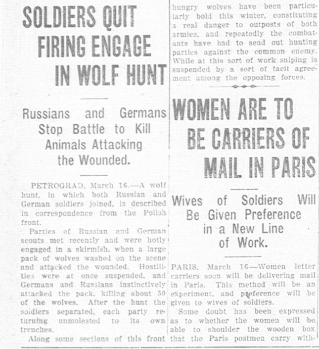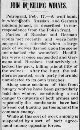 В этой заметке, якобы переданной из Петрограда, говорилось о новости с польского фронта, согласно которой группы русских и немецких разведчиков случайно столкнулись друг с другом и начали перестрелку, но вдруг на поле боя появилась большая стая волков и напала на раненых. Боевые действия пришлось приостановить. Временно объединившись, солдаты расстреляли полсотни хищников, и лишь после этого разошлись в разные стороны, вернувшись в свои окопы