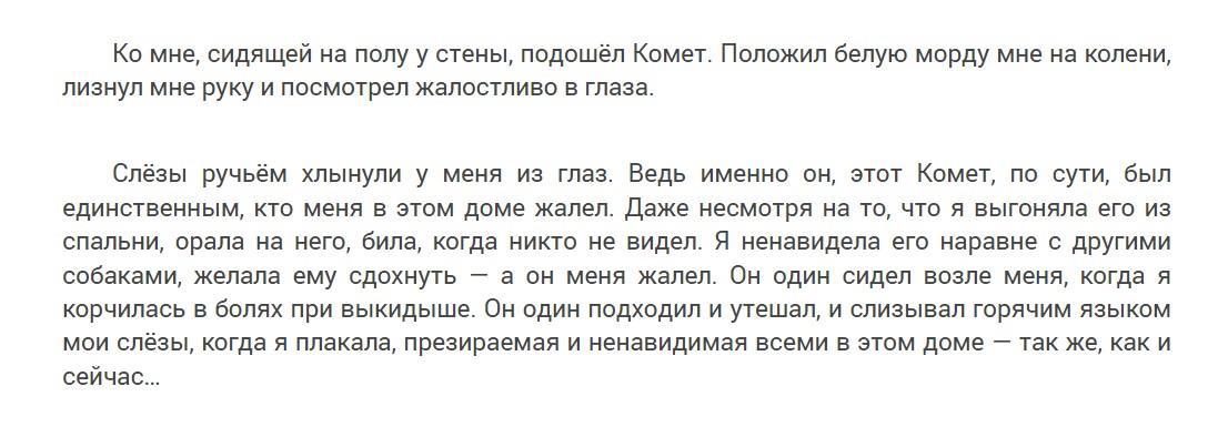 Задаю себе вопрос: а стала бы я жить с человеком, который бил бы мою собаку, когда никто не видит? Да ни дня! Однако у меня создалось впечатление, что многие читатели сочувствуют героине, а не её мужу, и для меня это очень странно.
