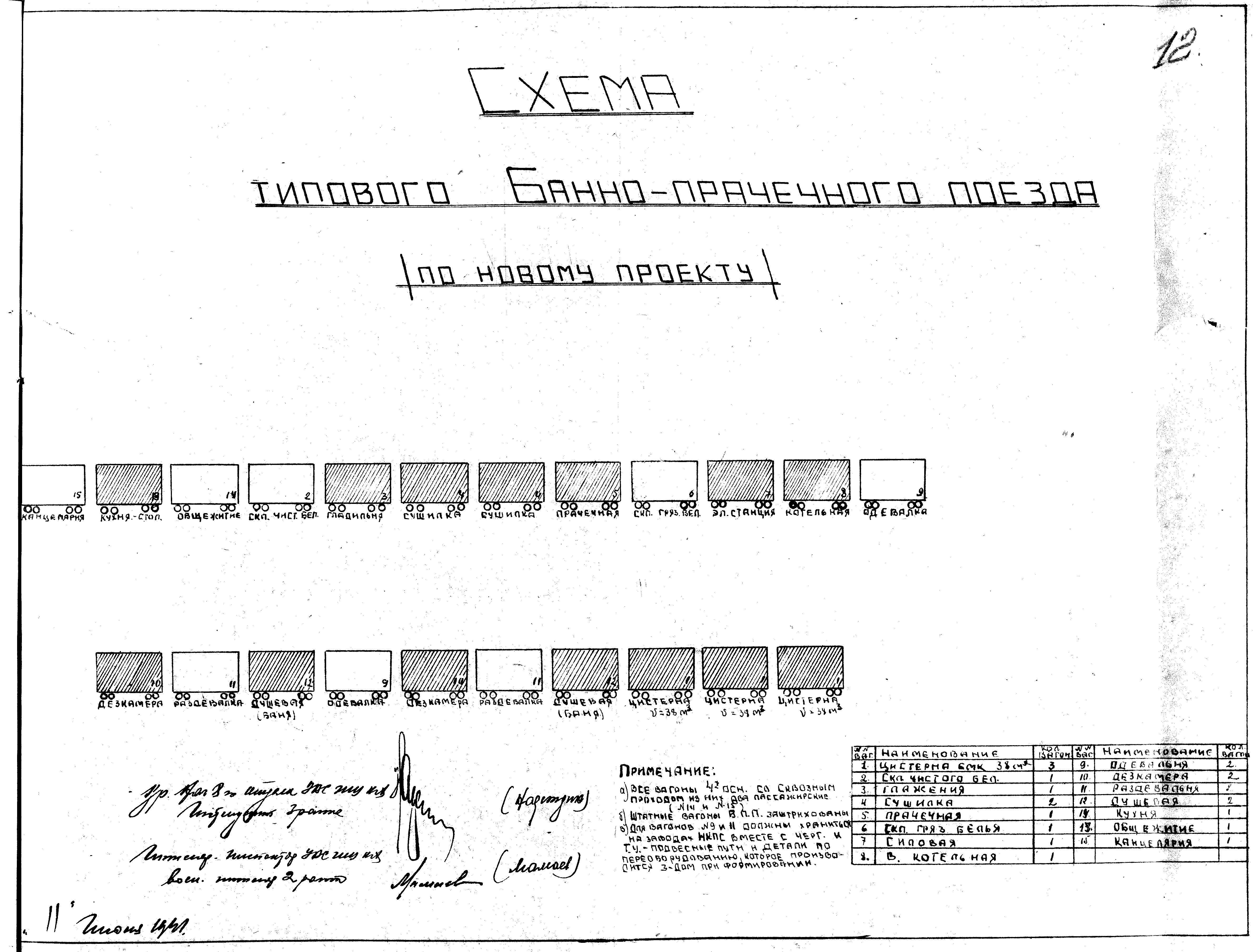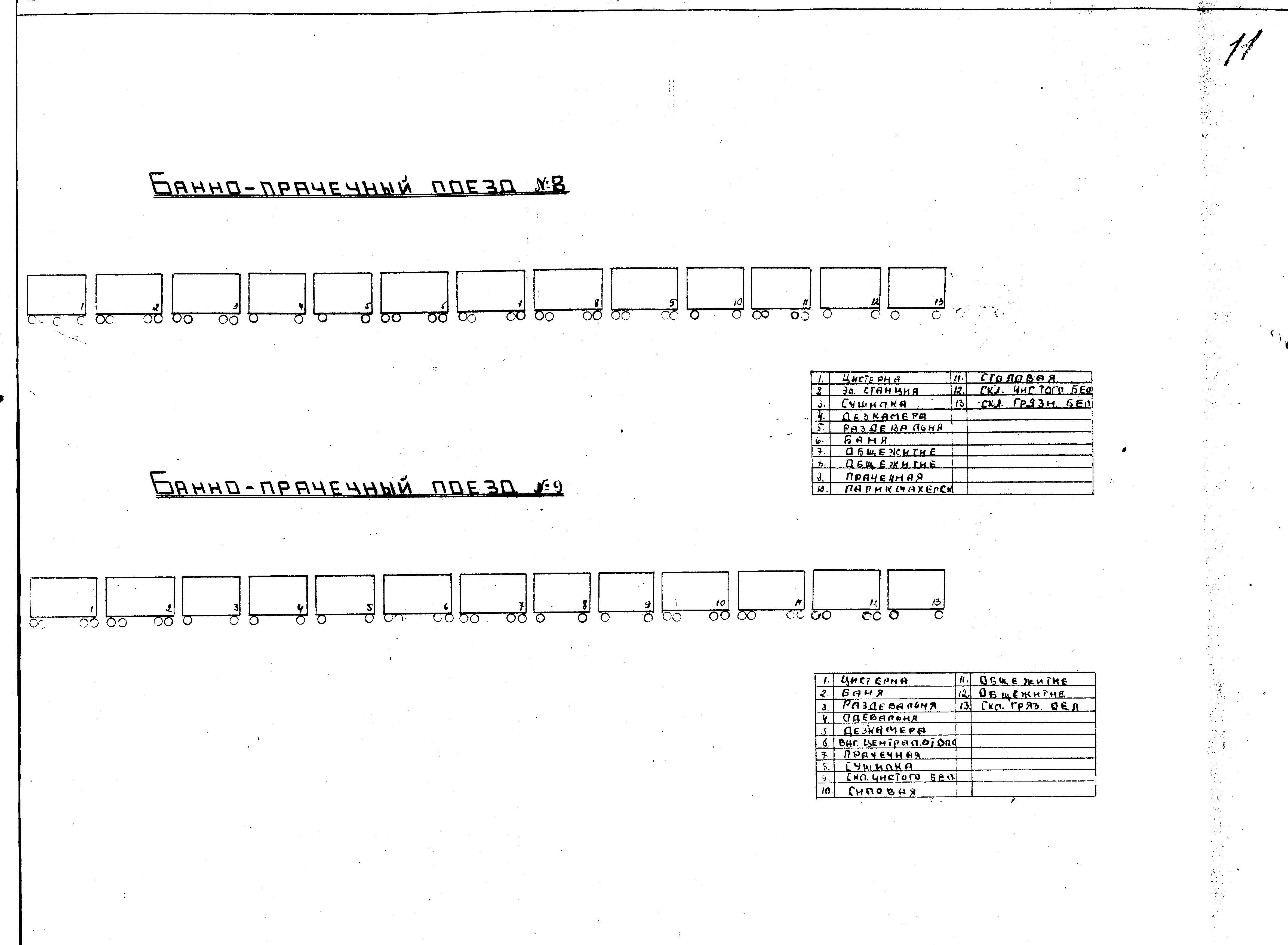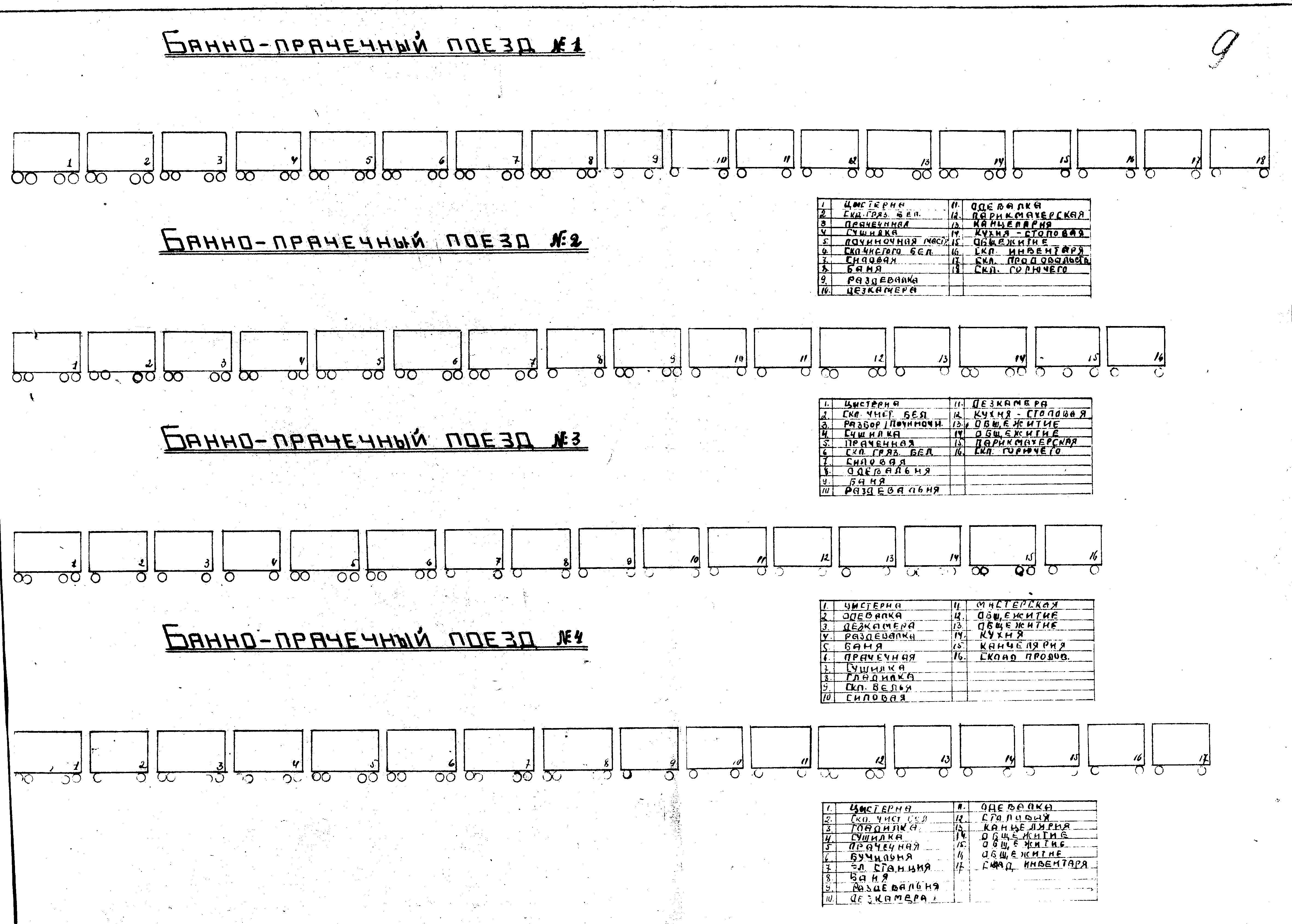 А в сентябре 1941 г., в составе Красной Армии состояло 9 банно-прачечных поездов, в которых бойцы не только мылись и дезинфицировали обмундирование, но и стиралось бельё. Так как, это были всё же организации военного времени, то и сотрудники Наркомата путей сообщения СССР смогли сформировать их, как могли. Потому и состояли БПП из разного количества вагонов, от 13 до 17 единиц транспорта.