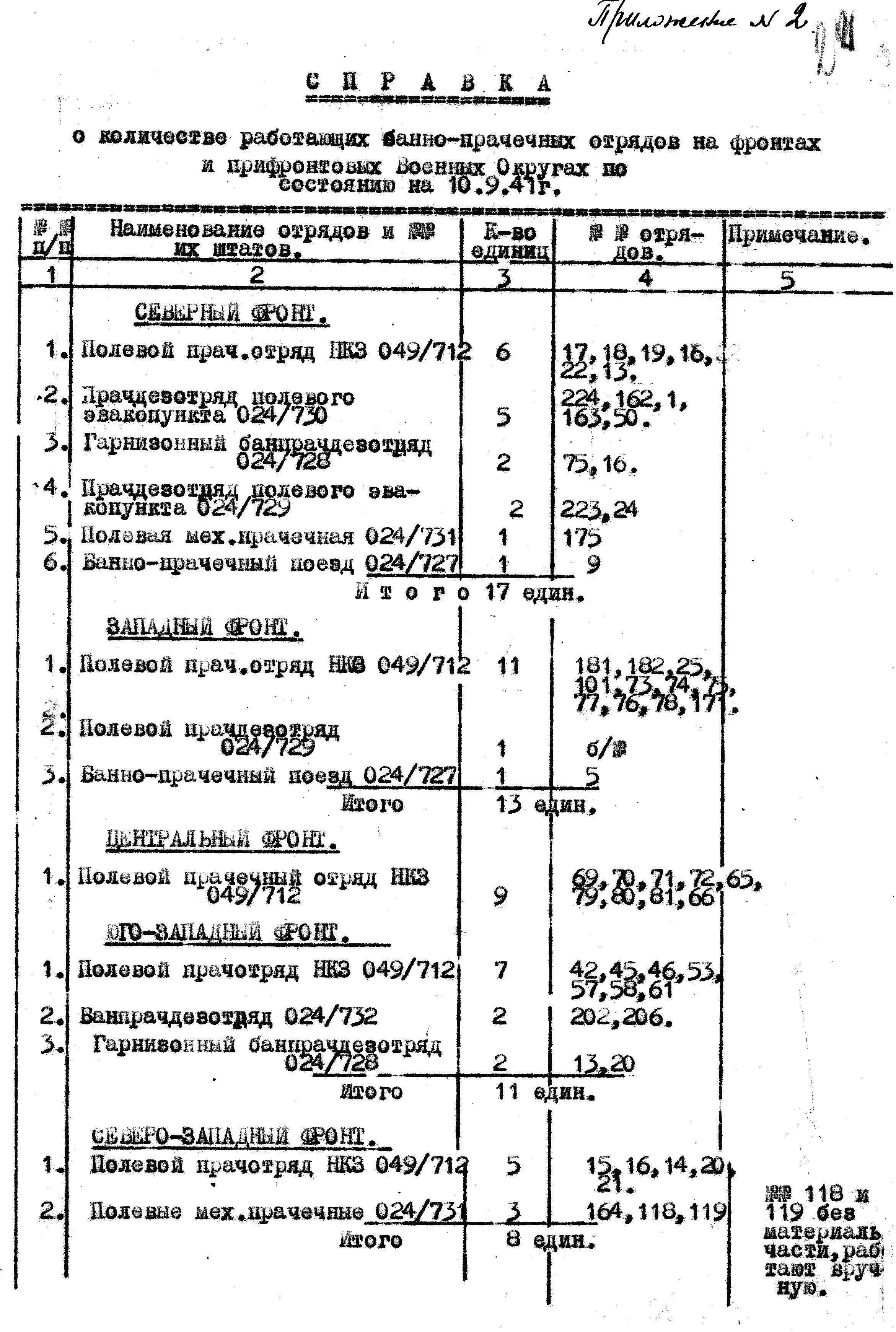 Да, в мирное время в банно-прачечных подразделений не существовало, их формирование началось с первых дней войны. По состоянию на 10 сентября, в составе действующей армии работали 9 банно-прачечных поездов и 48 полевых прачечных отрядов. Ещё 32 прачечных отряда, для 4-х фронтов, завершали формирования. Кроме того, имеющееся оборудование позволяло сформировать дополнительно 46 - 50 прачечных отрядов.
