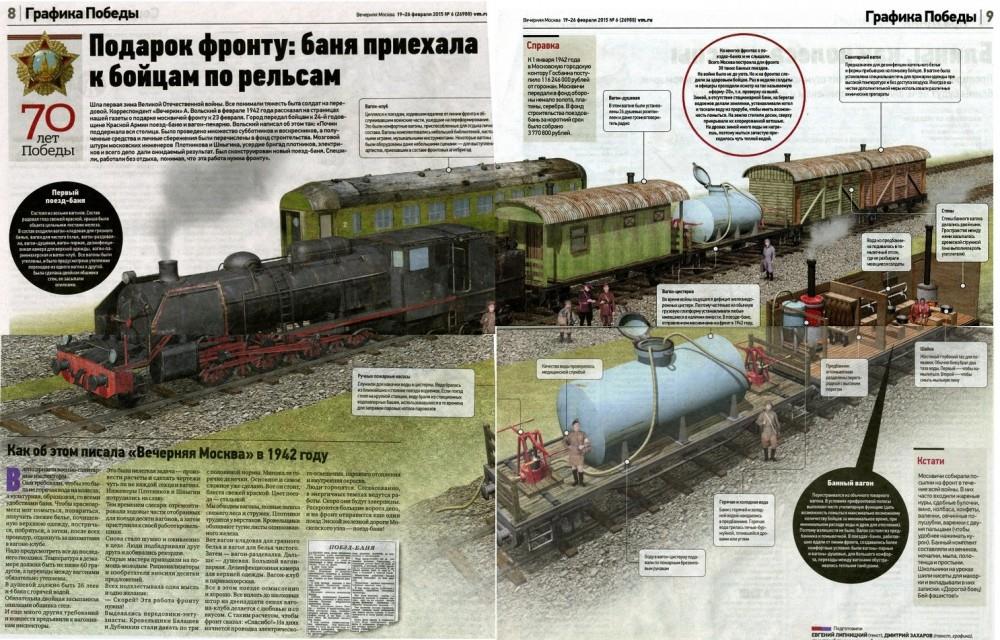 А теперь поговорим о поездах. В сети очень часто говорится о поездах- банях, основными задачами которых была помывка бойцов, а также прожарка белья и обмундирования. Вот такую схему поезда, построенного в Москве, приводят для образца: