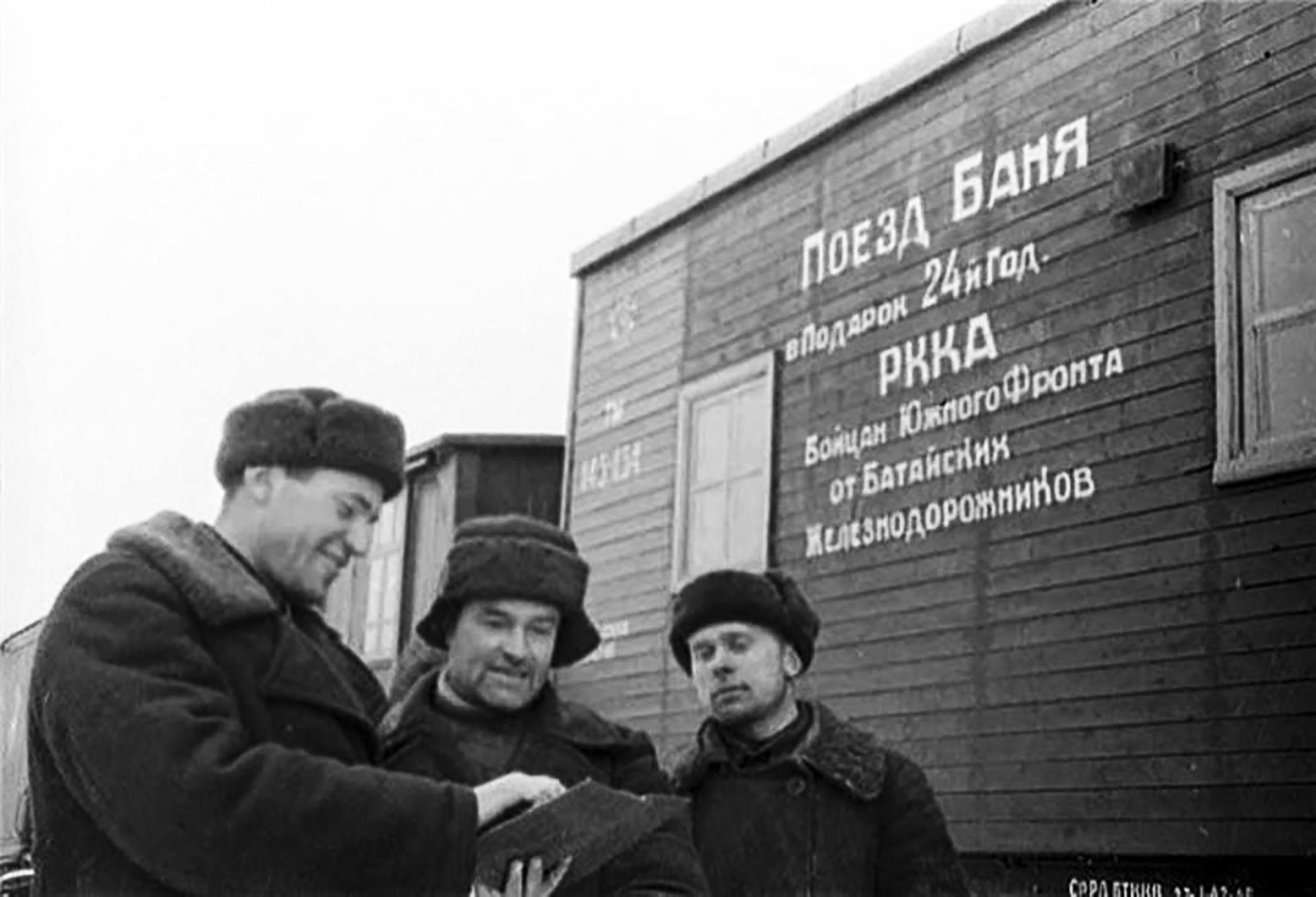 Генерал, по воспоминаниям начальника поезда-бани, приехал со своим штабом. Они попарились, помылись. Причем, Рокоссовский предпочел хозяйственное мыло, он сказал: «Мне не привыкать». «Но что еще было интересно — Рокоссовский дал команду помыть, попарить и проутюжить фельдмаршала Паулюса и его генералов. И начальник поезда вспоминает, что Паулюса и трех генералов доставили на следующий день под охраной. От парилки они отказались. Мылись в душевой, пока их форму прожарили в дезкамере и отутюжили. Потом парикмахеры их подстригли, побрили, поодеколонили. Вот они пользовались только туалетным мылом».