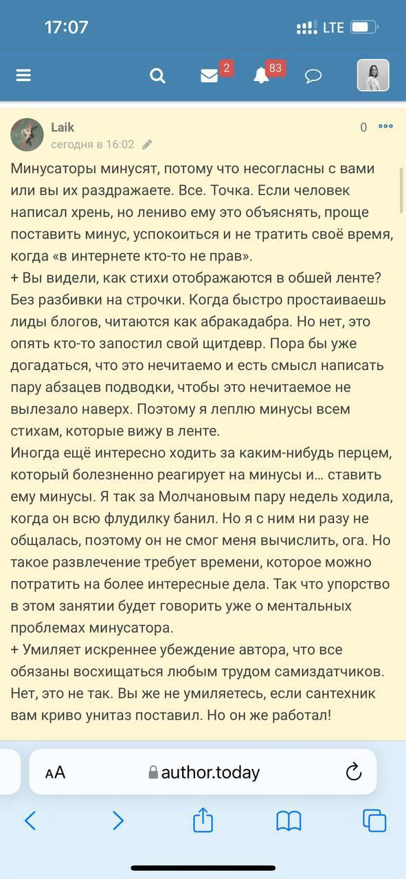 Если бы я писала стихи, то обязательно бы занесла товарища в чс. Потому что его минус - это не показатель того, что стих не зашел, а просто минус от балды.